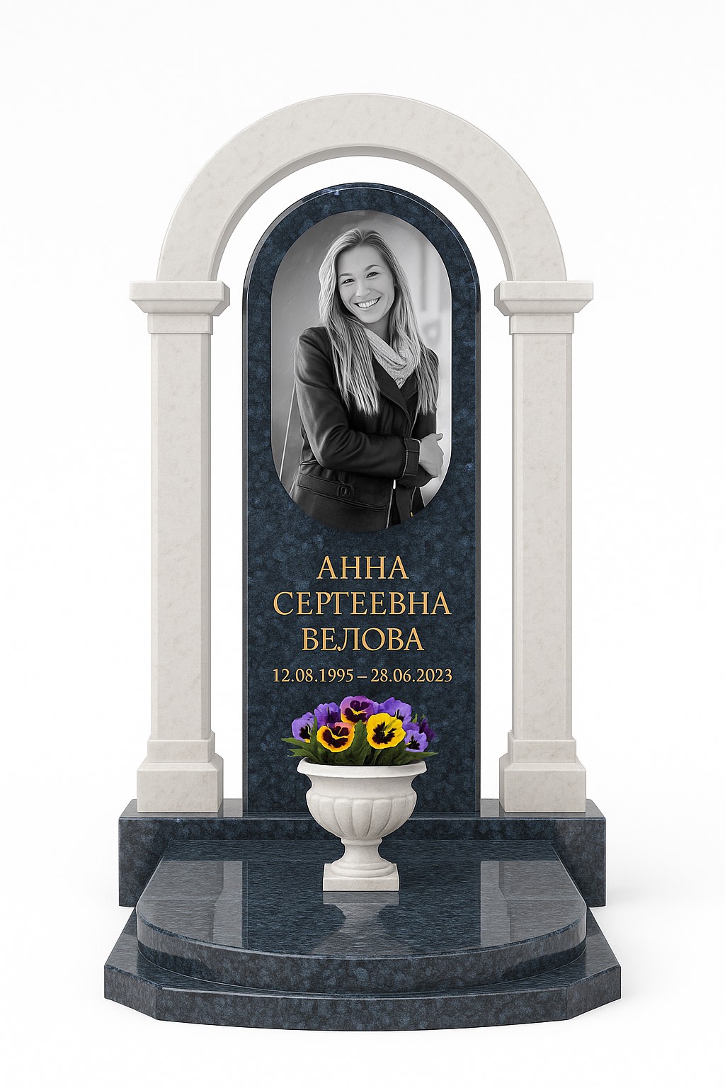 Центральным элементом является фотостекло арочной формы, установленное на прочные нержавеющие метизы. Под изображением размещена золотая гравировка ФИО и дат, выполненная с высокой точностью. У основания — изящное облегчённое надгробие толщиной всего 3 см, украшенное фирменной фаской 1,5 см. В центре установлена классическая ваза с анютиными глазками, символизирующая светлую память.