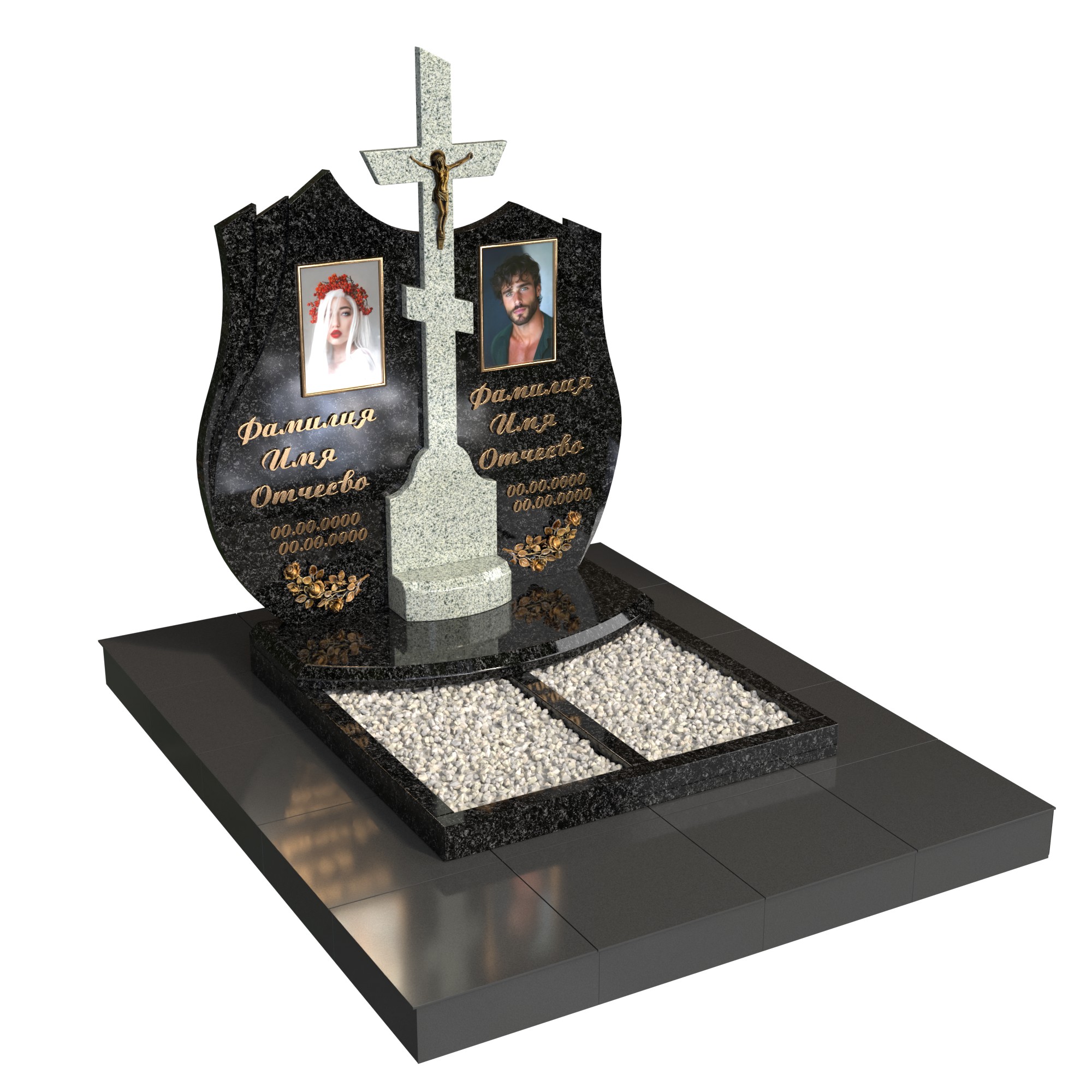 Парный памятник «Семейный щит» — торжественный семейный комплекс для двух захоронений. Две фигурные стелы в форме щитов объединены центральным каменным крестом, символизируя защиту и единство. В каждой стеле — фотопортрет на стекле и индивидуальная гравировка. Внизу — аккуратный двухсекционный цветник с мраморной крошкой; композицию дополняет изящный декоративный элемент и постамент.