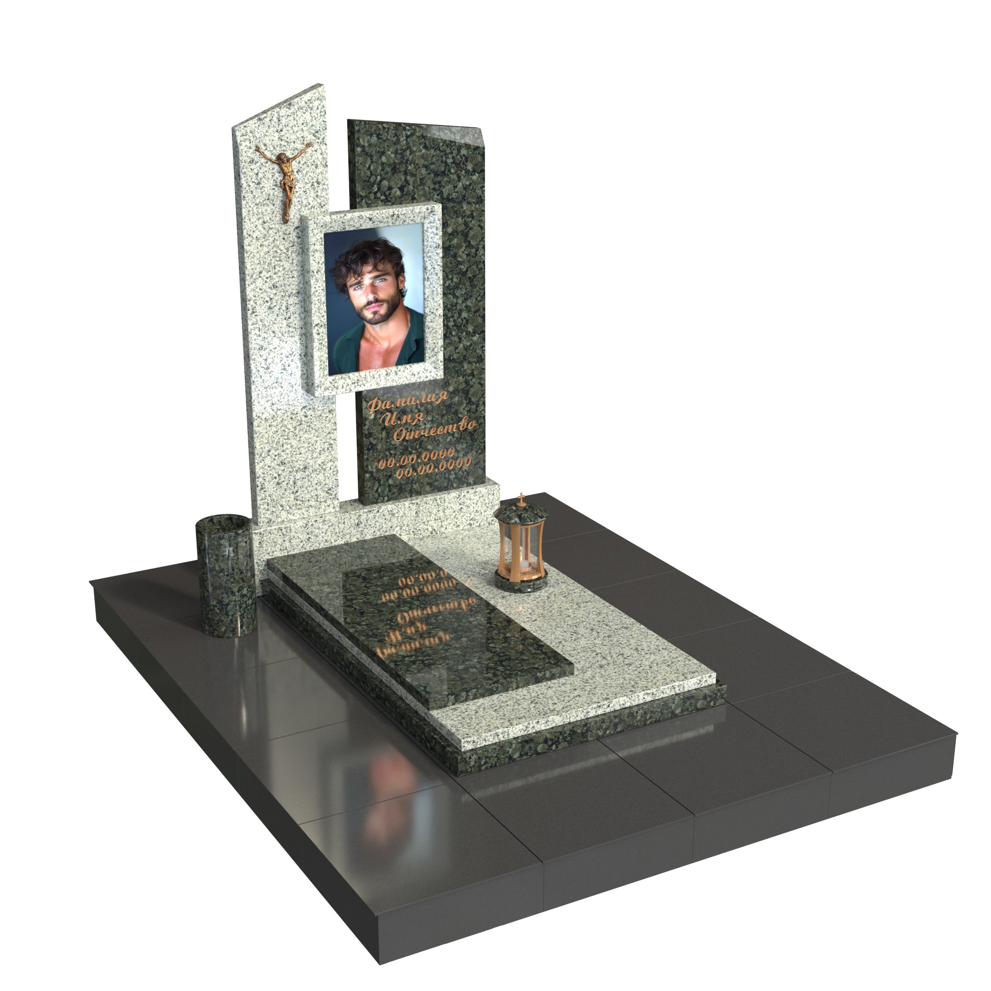 Две асимметричные вертикальные плиты словно символизируют силу и защиту, а размещённый между ними фотопортрет в стеклянной вставке делает композицию живой и личной. Бронзовая фигура Христа добавляет сакральный смысл, а лампада и ваза завершают образ продуманной, целостной мемориальной архитектуры.