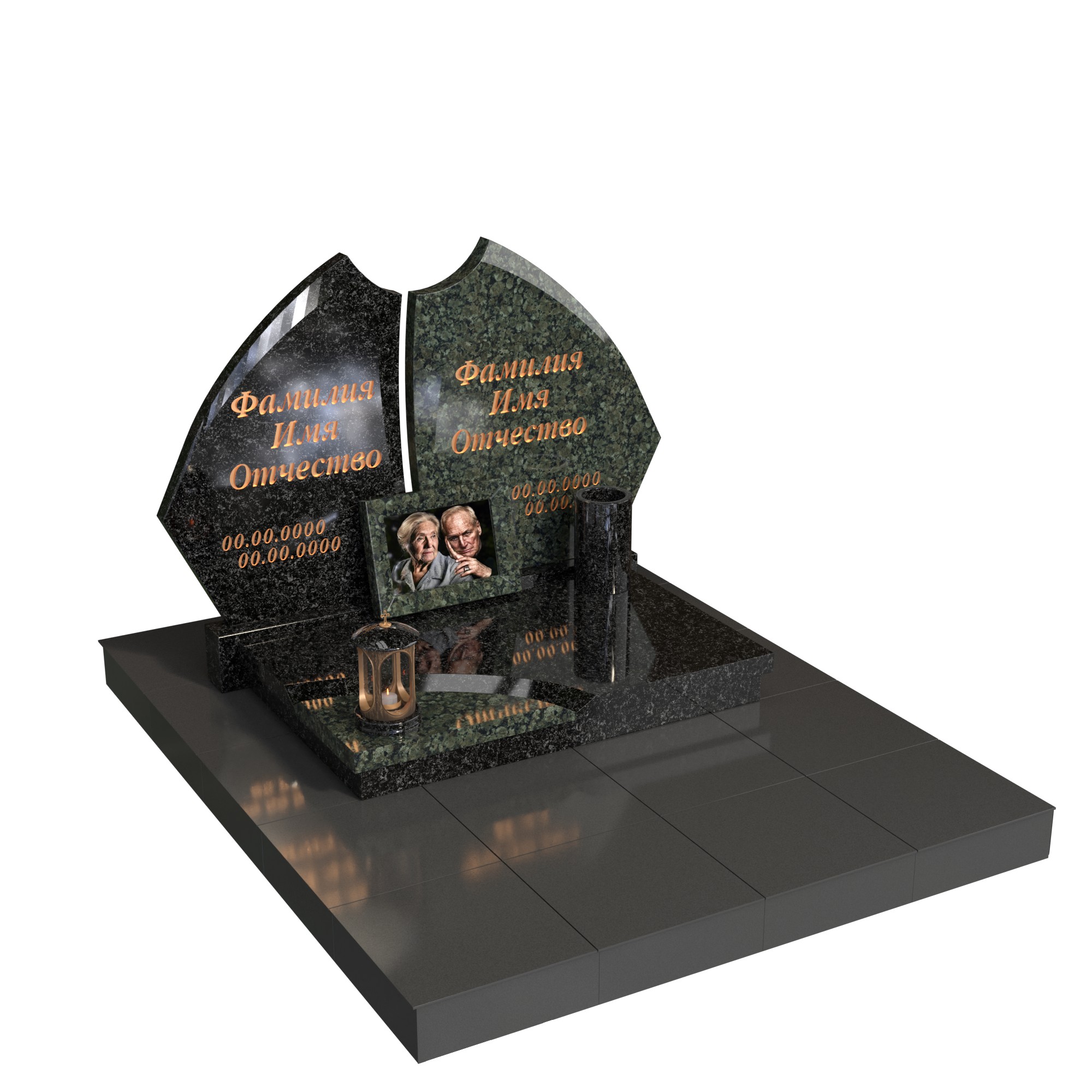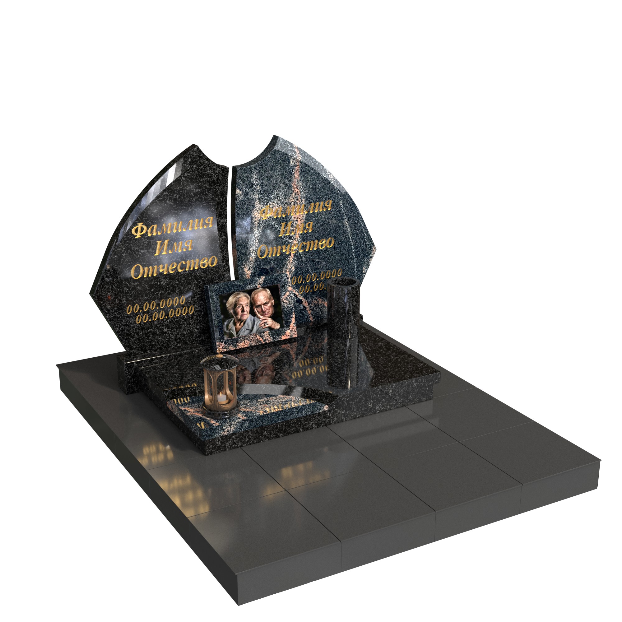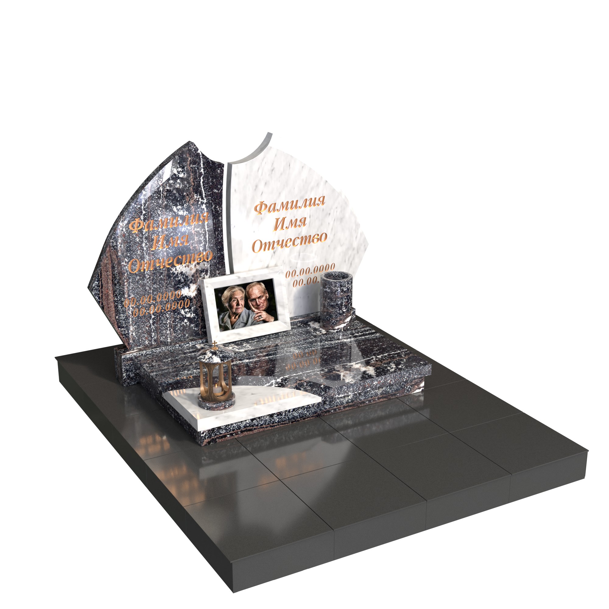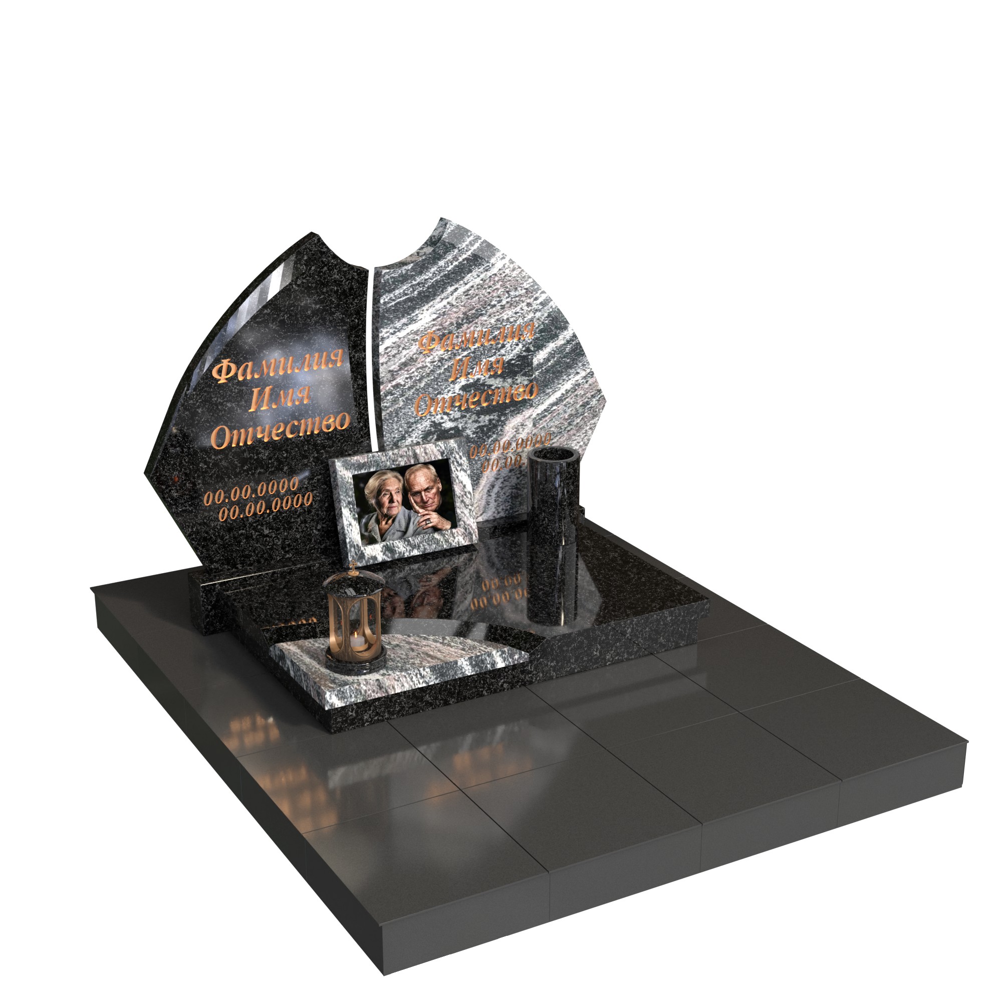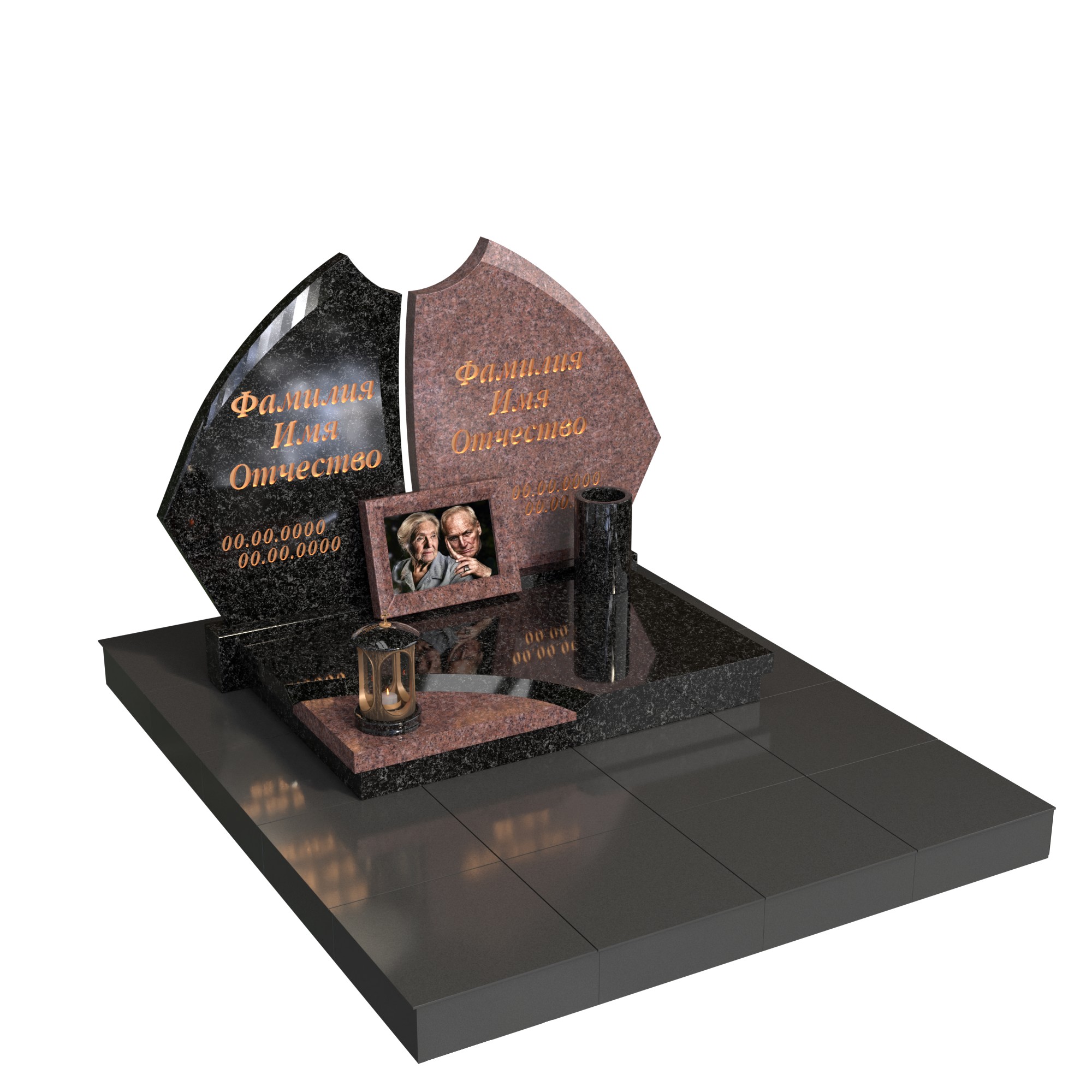 Контрастное сочетание благородных пород гранита подчеркивает индивидуальность каждого, а общее основание объединяет их в вечном союзе. На горизонтальной плите предусмотрено место для фоторамки с изображением пары — как напоминание о нежности и жизненном пути, пройденном вместе.