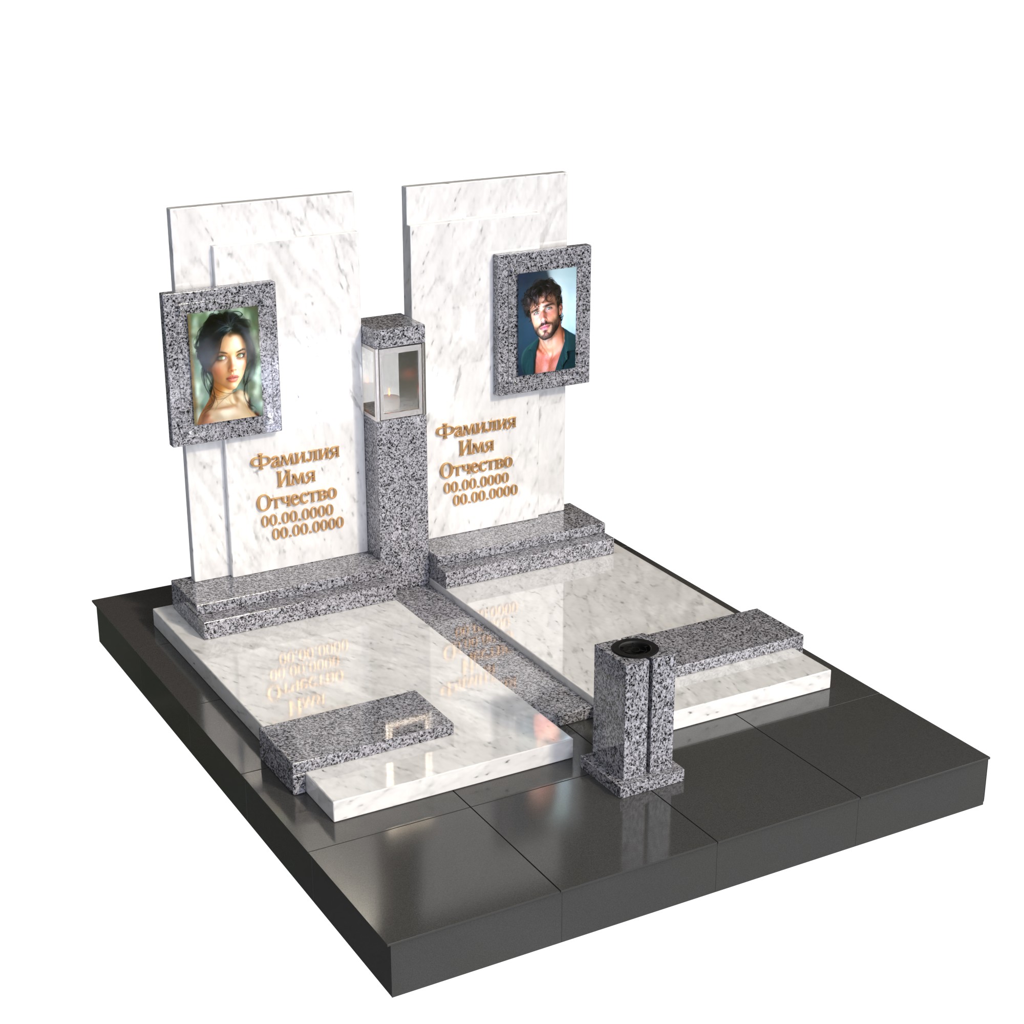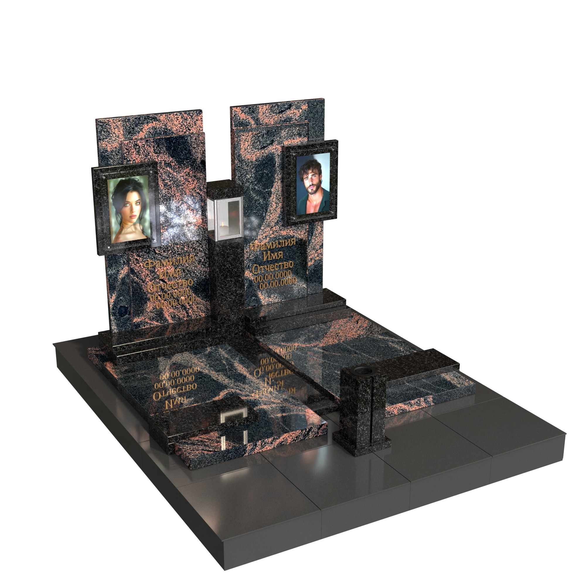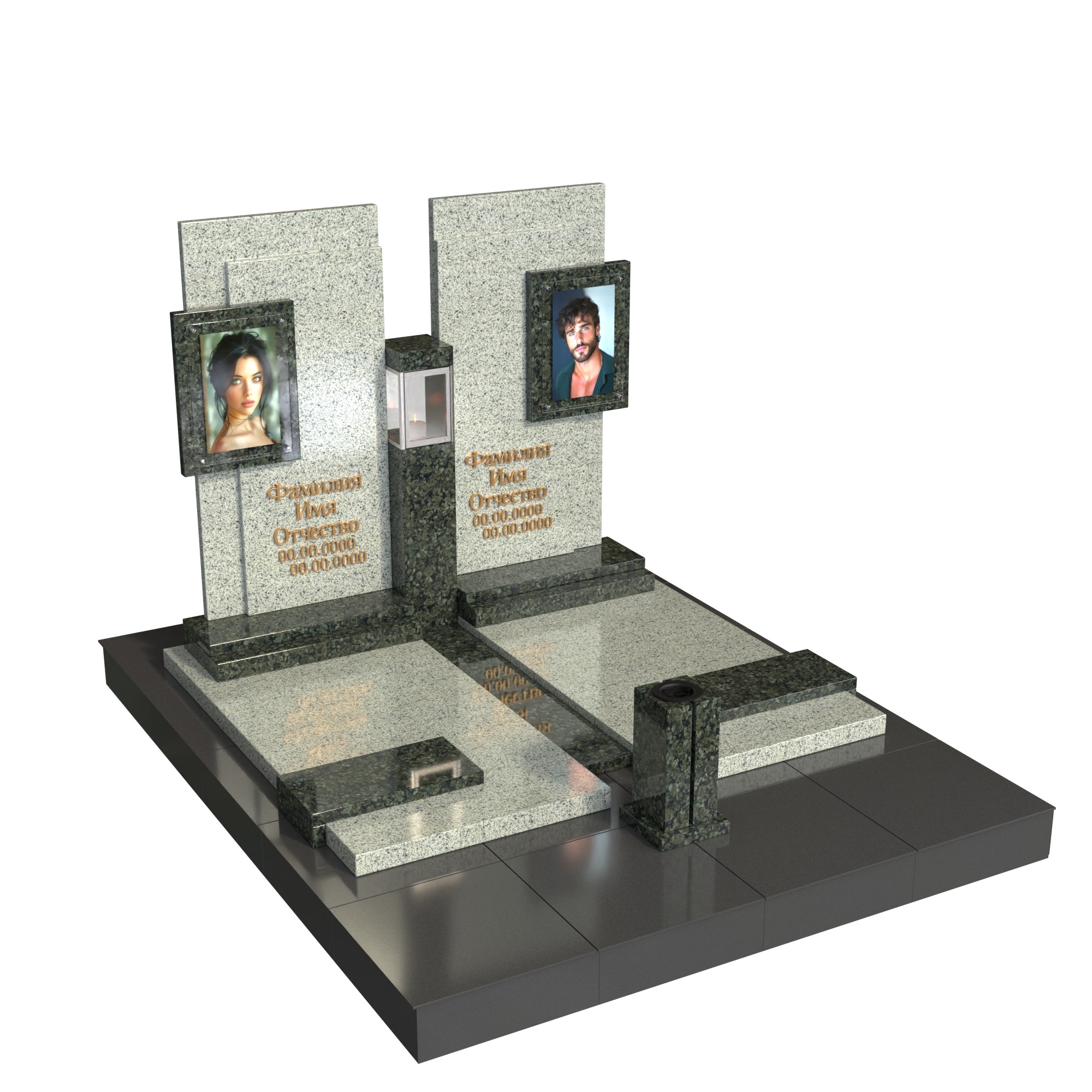 Парный памятник «Единство судеб» — современный мемориальный комплекс для двух захоронений. Две симметричные стелы из натурального камня образуют единую архитектуру, символизируя связь и поддержку на протяжении всей жизни. В каждой стеле — фотопортрет на стекле (крепление на метизах) и индивидуальная гравировка. Центральная лампада и единое основание подчёркивают торжественность и завершённость композиции; предусмотрено место под цветник и аксессуары.