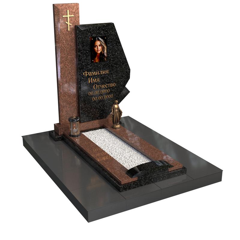 Памятник «Грань вечности» — это элегантный и выразительный монумент, выполненный из двух благородных камней: тёплого Лезниковского гранита с насыщенным бордово-красным оттенком и глубокого чёрного габбро-диабаза. Контраст этих материалов символизирует границу между земной жизнью и вечной памятью, между теплом воспоминаний и спокойствием вечности.