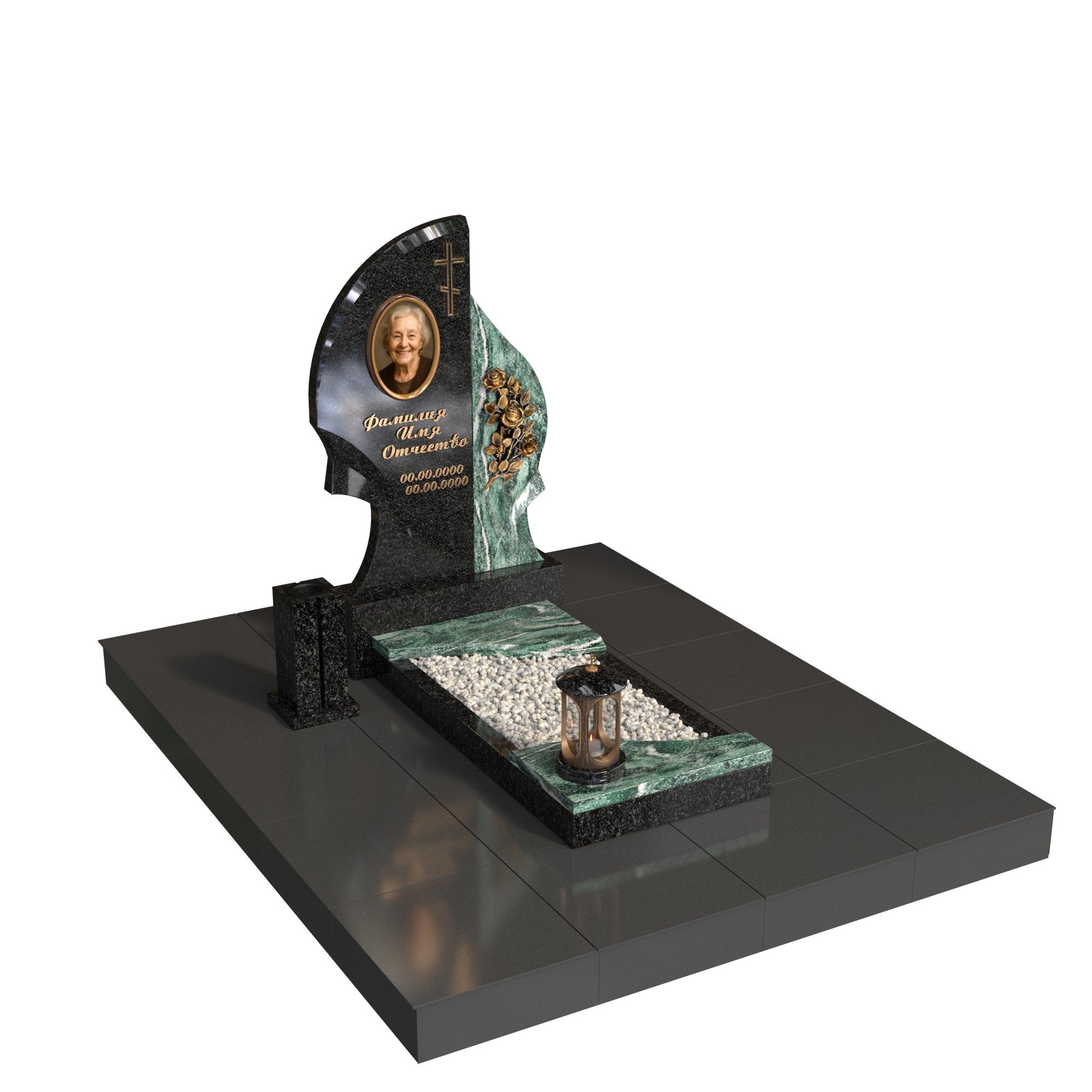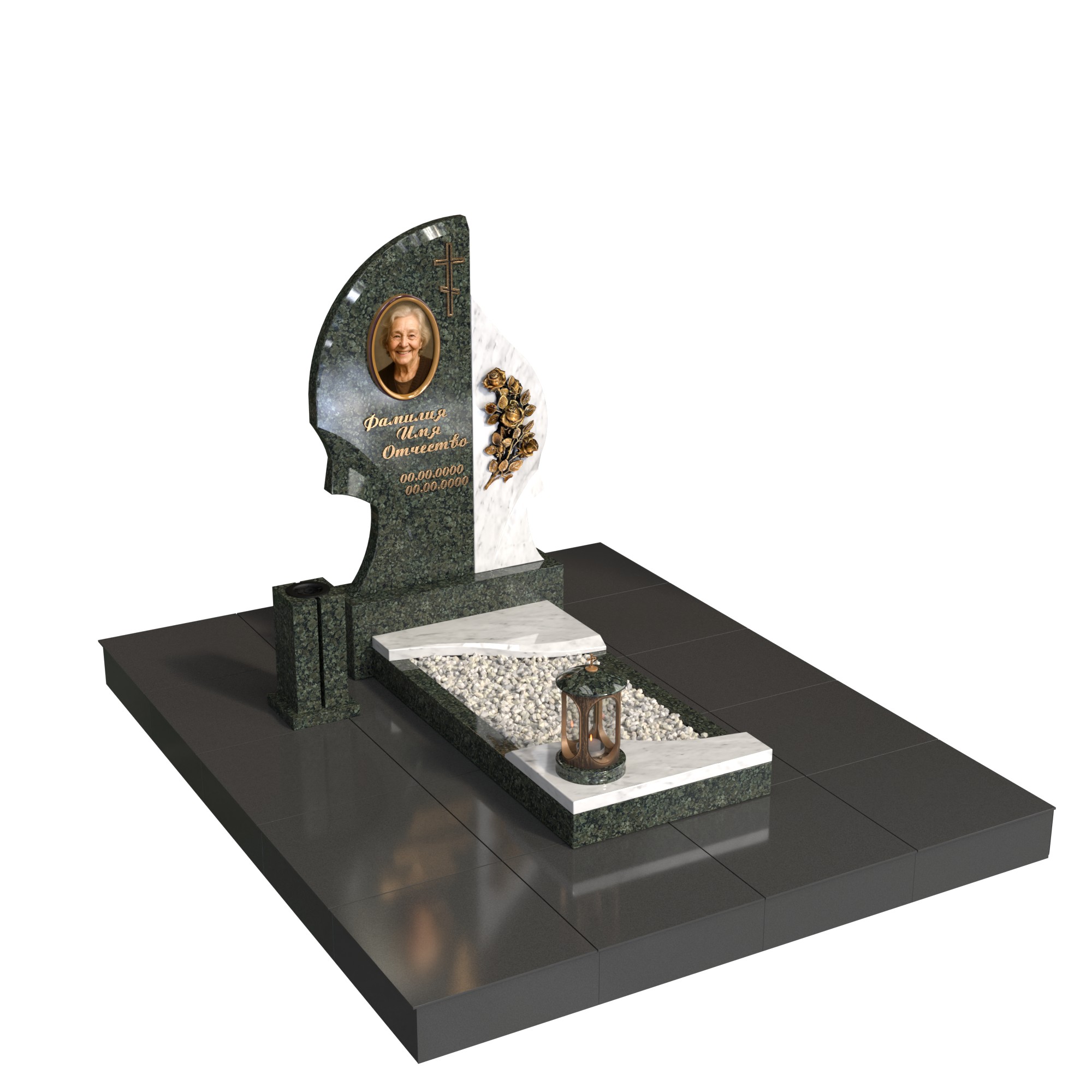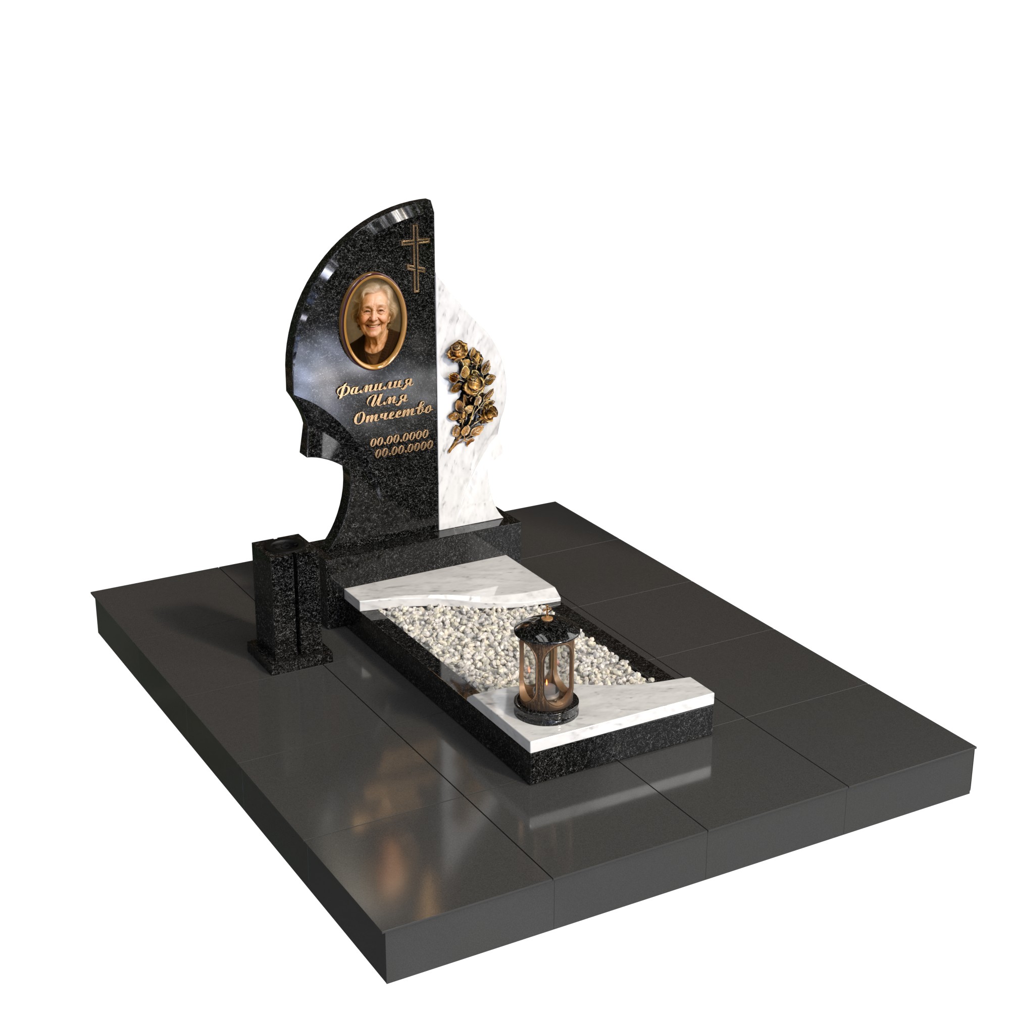 Одиночный комбинированный памятник с фигурной стелой в форме листа. Эффектное сочетание полированного гранита и белоснежного мрамора подчёркивает светлую, аккуратную композицию. На стеле предусмотрено место под овальный портрет (фотокерамика или фото на стекле), крест и декоративная бронзовая ветка. Цветник выполнен с мраморной накладкой и белым гравием, в комплекте — площадка под лампаду/вазу.
