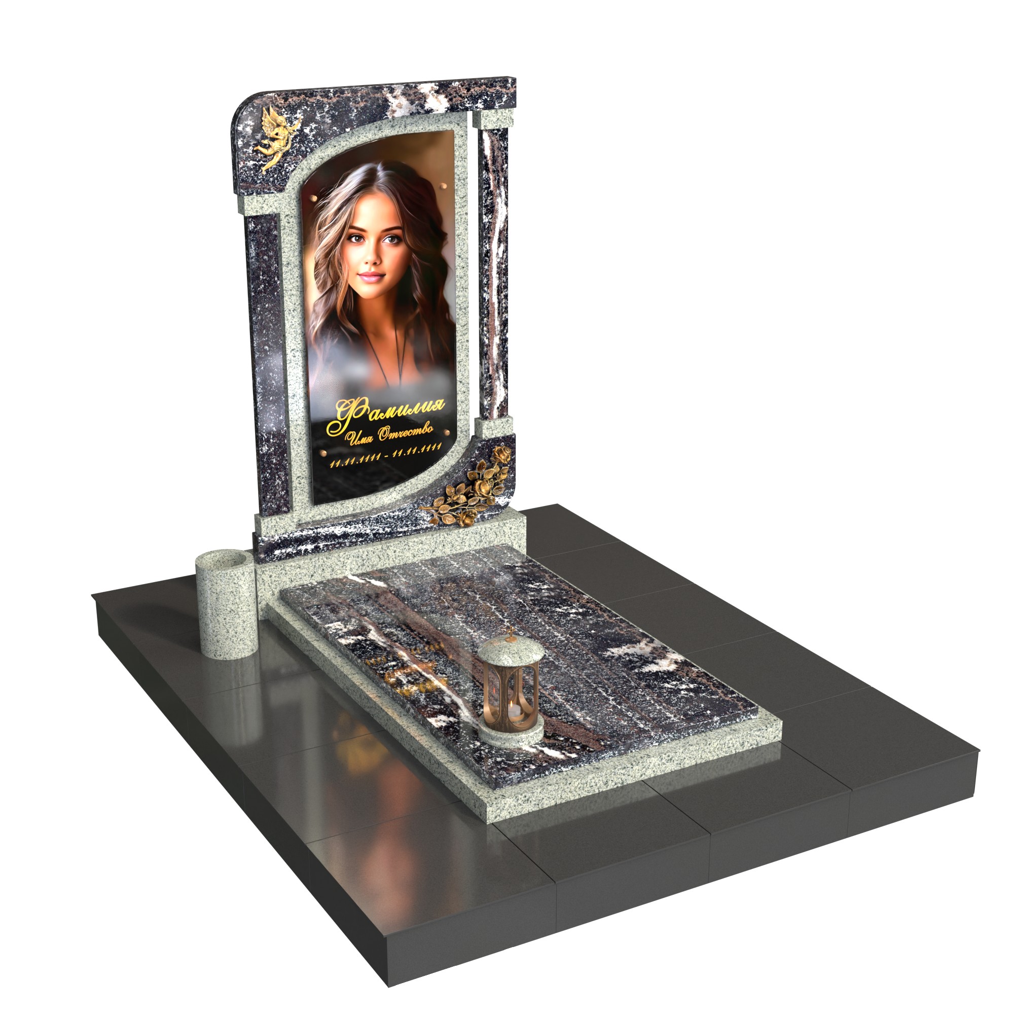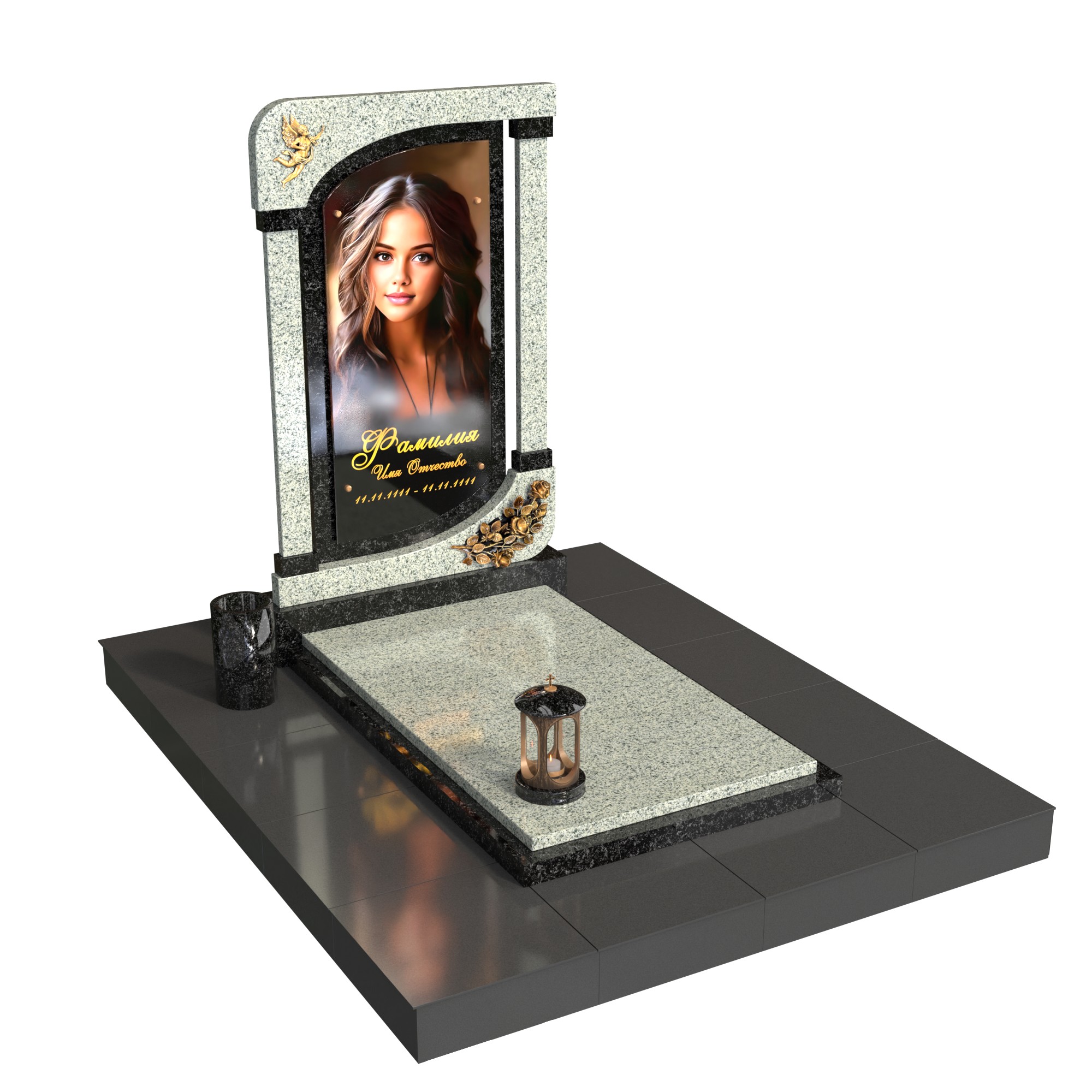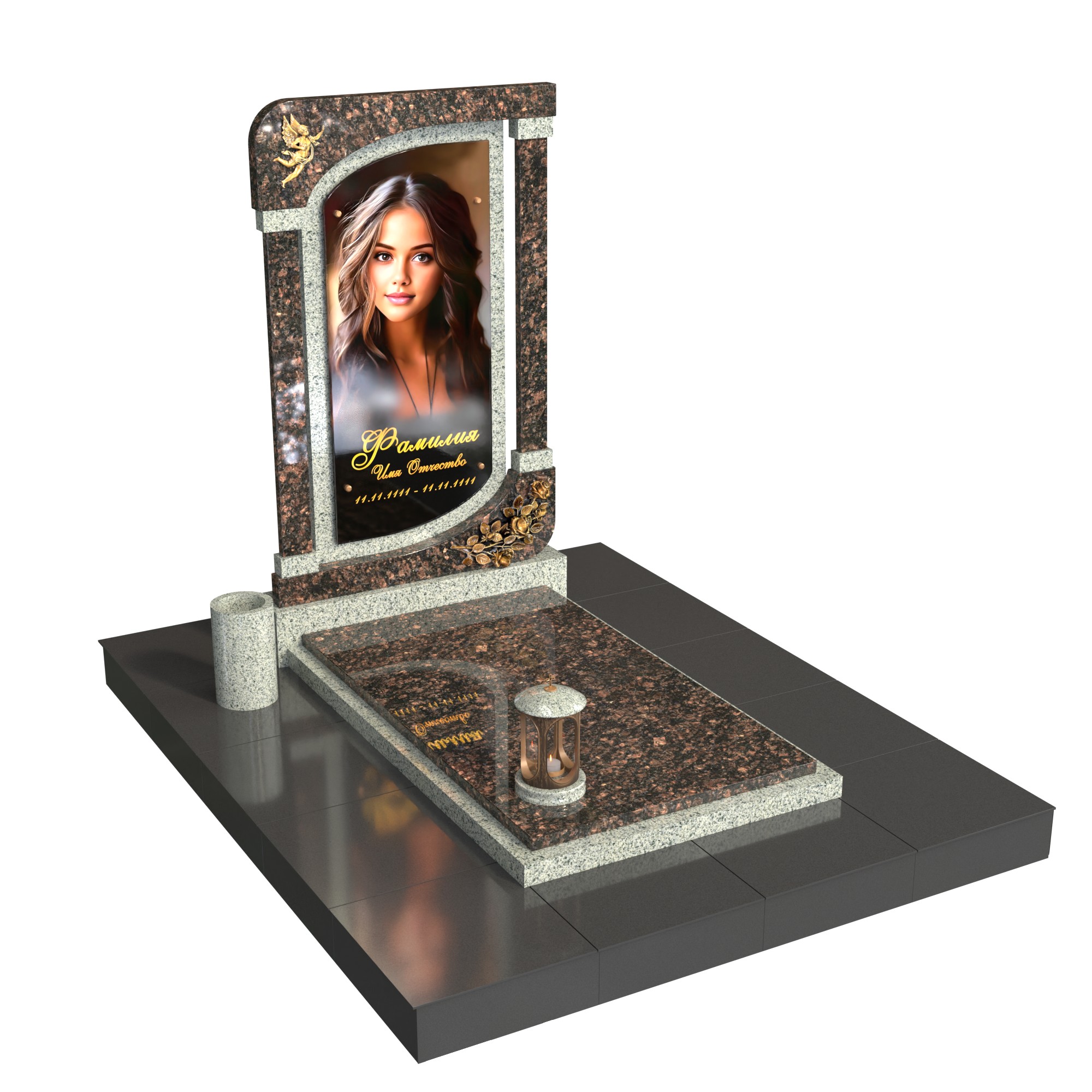Контрастная структура натурального камня подчёркивает выразительность силуэта, а утончённый декор из бронзы в виде цветочной ветви и птицы символизирует лёгкость души и вечную любовь. Надгробная плита повторяет ритм камня, создавая гармоничное визуальное единство. Бронзовая лампада и аккуратная ваза завершают композицию.
