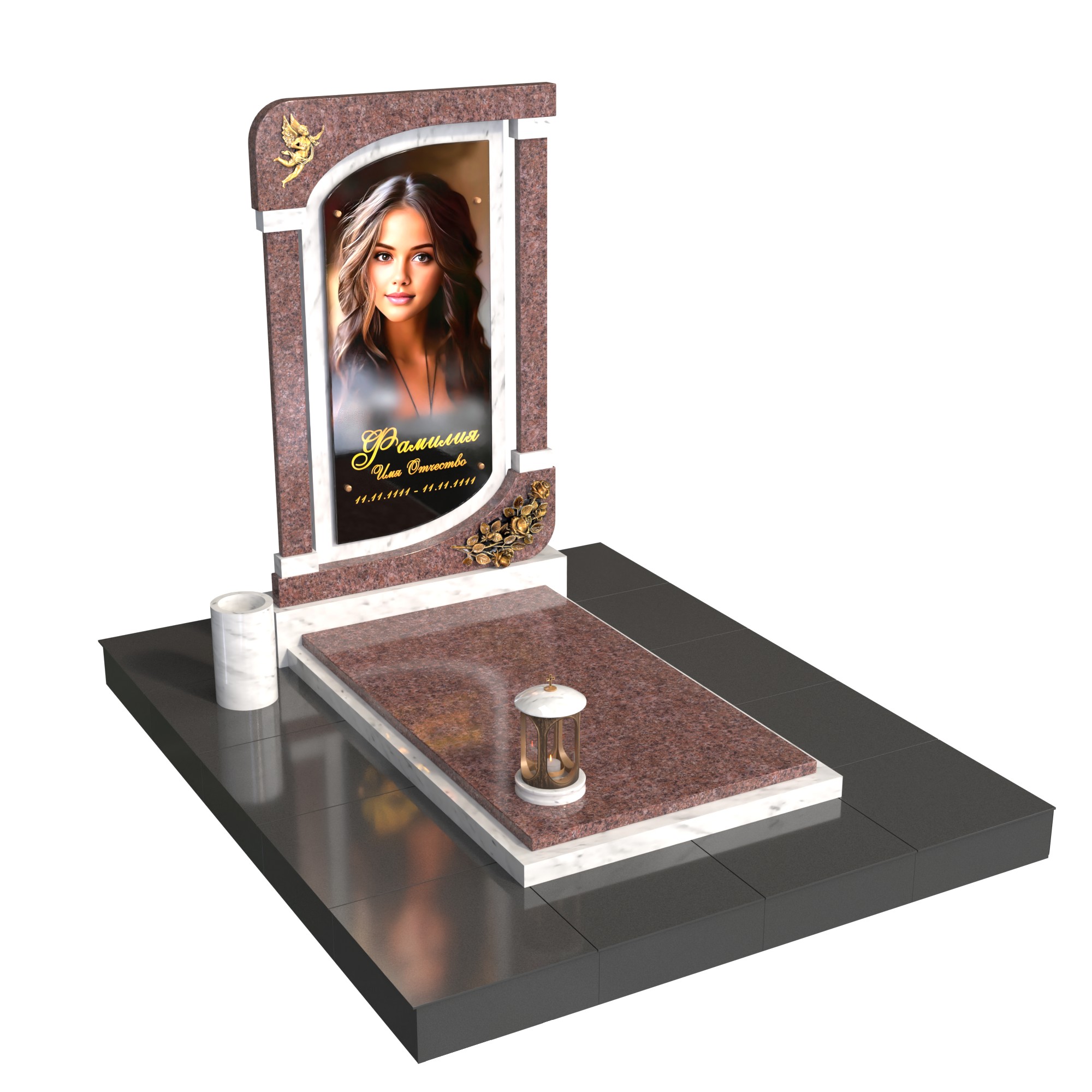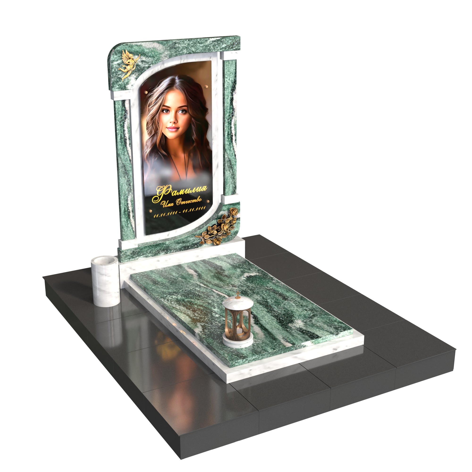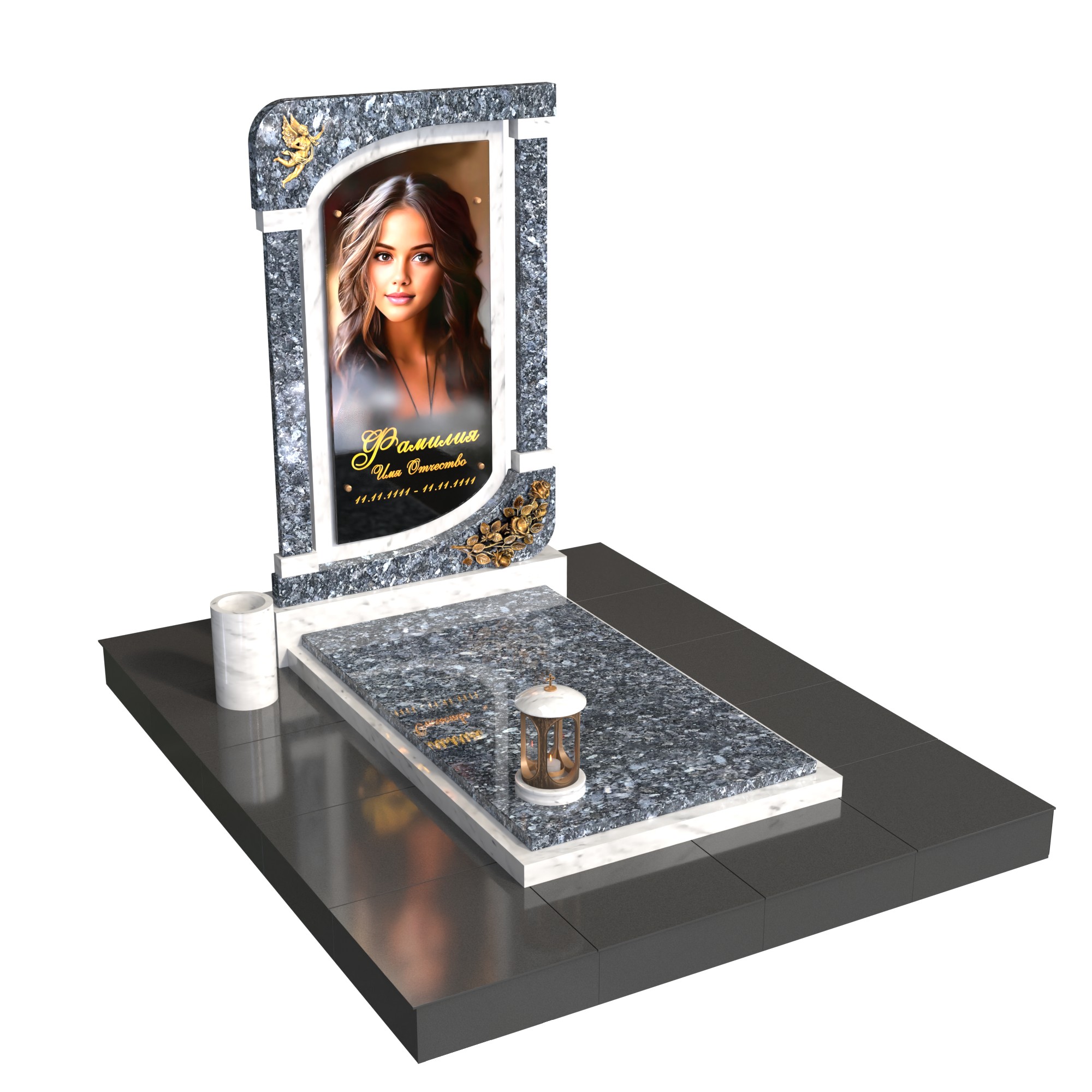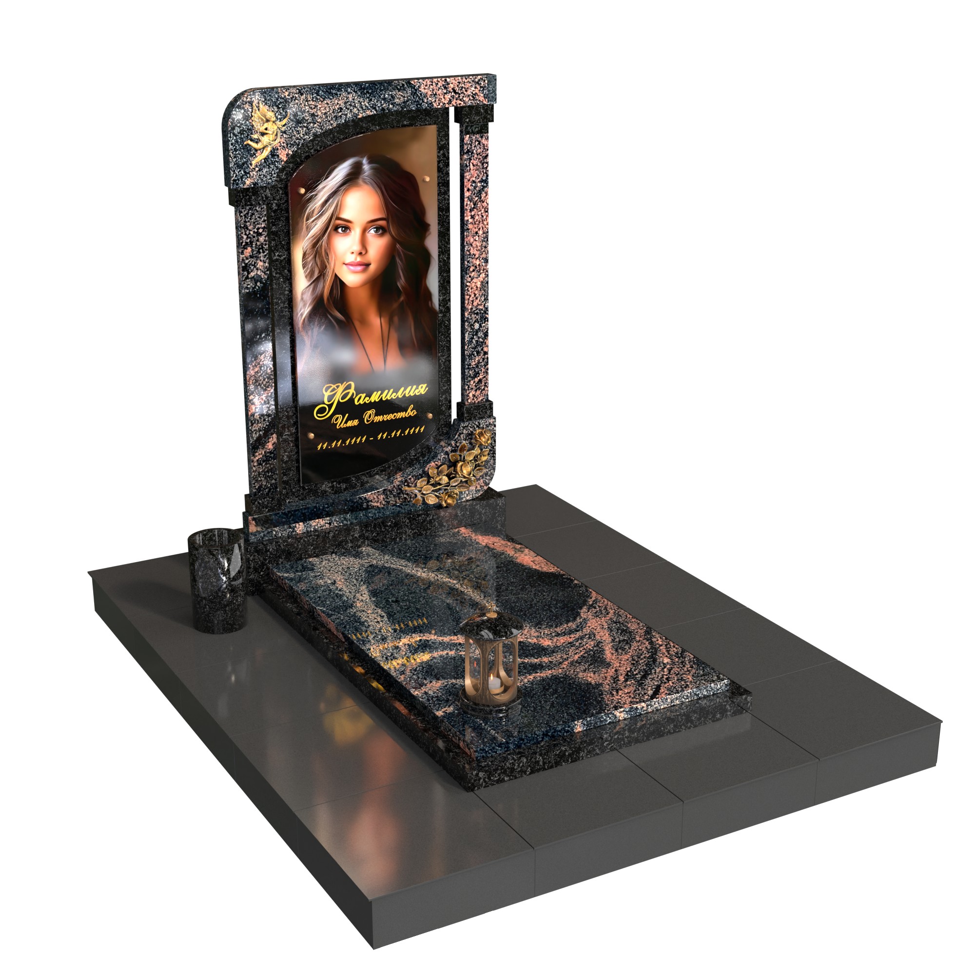 Контрастная структура натурального камня подчёркивает выразительность силуэта, а утончённый декор из бронзы в виде цветочной ветви и птицы символизирует лёгкость души и вечную любовь. Надгробная плита повторяет ритм камня, создавая гармоничное визуальное единство. Бронзовая лампада и аккуратная ваза завершают композицию.