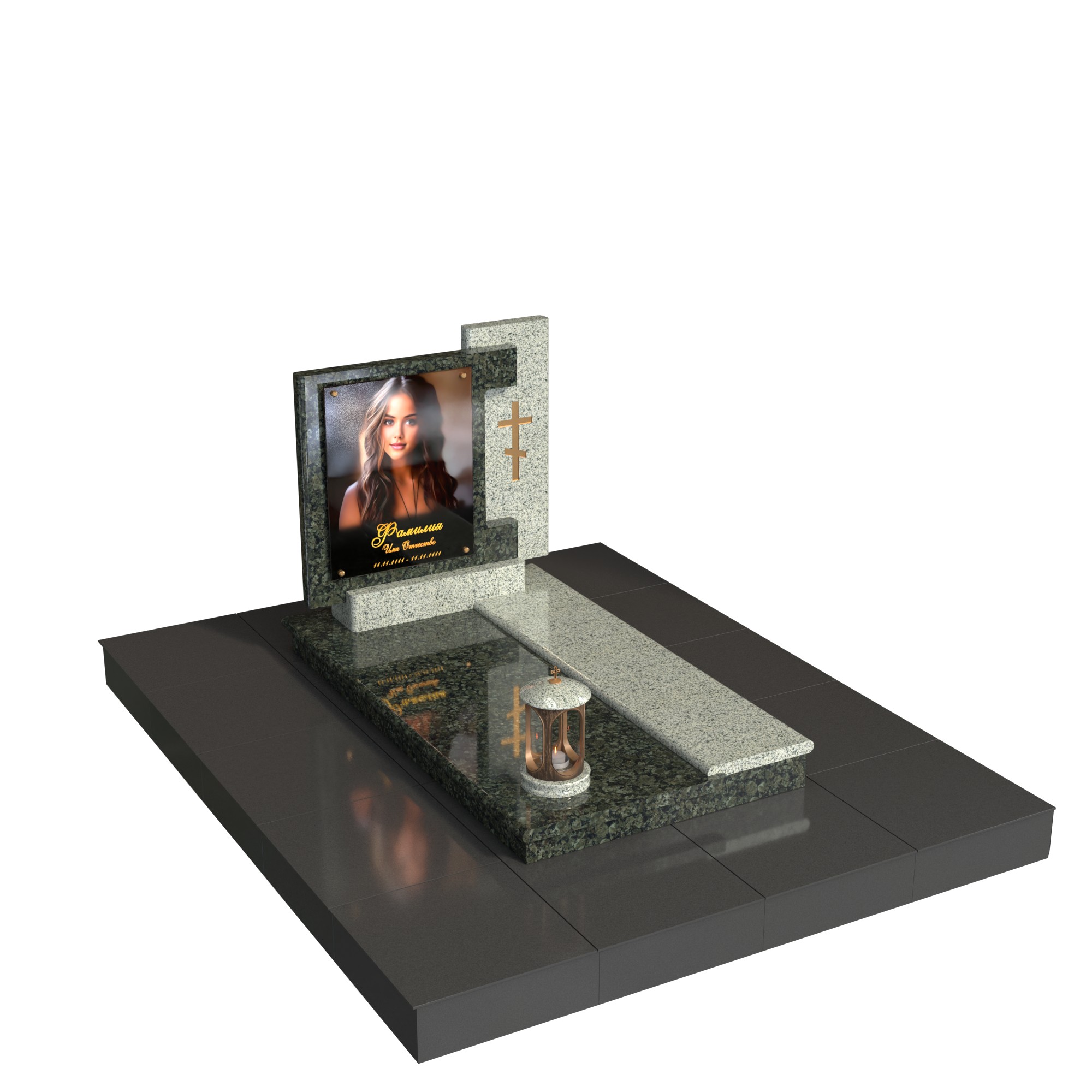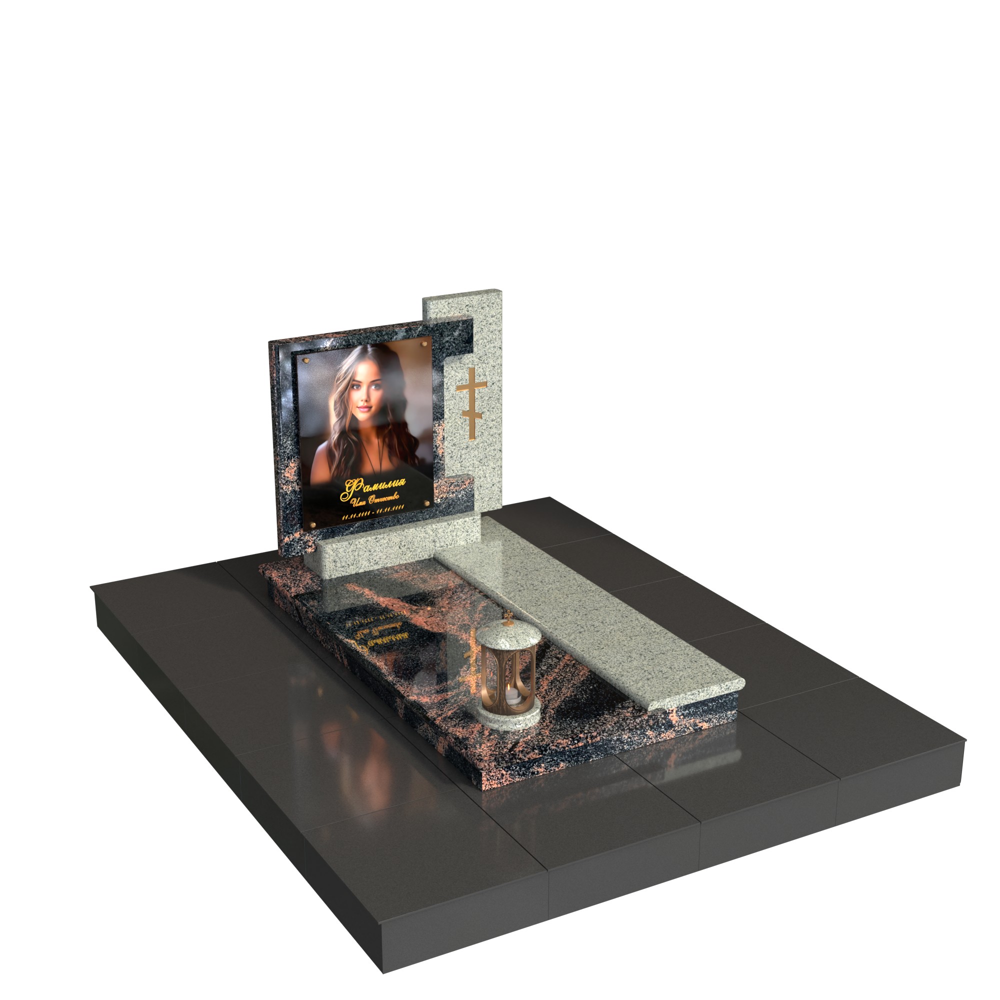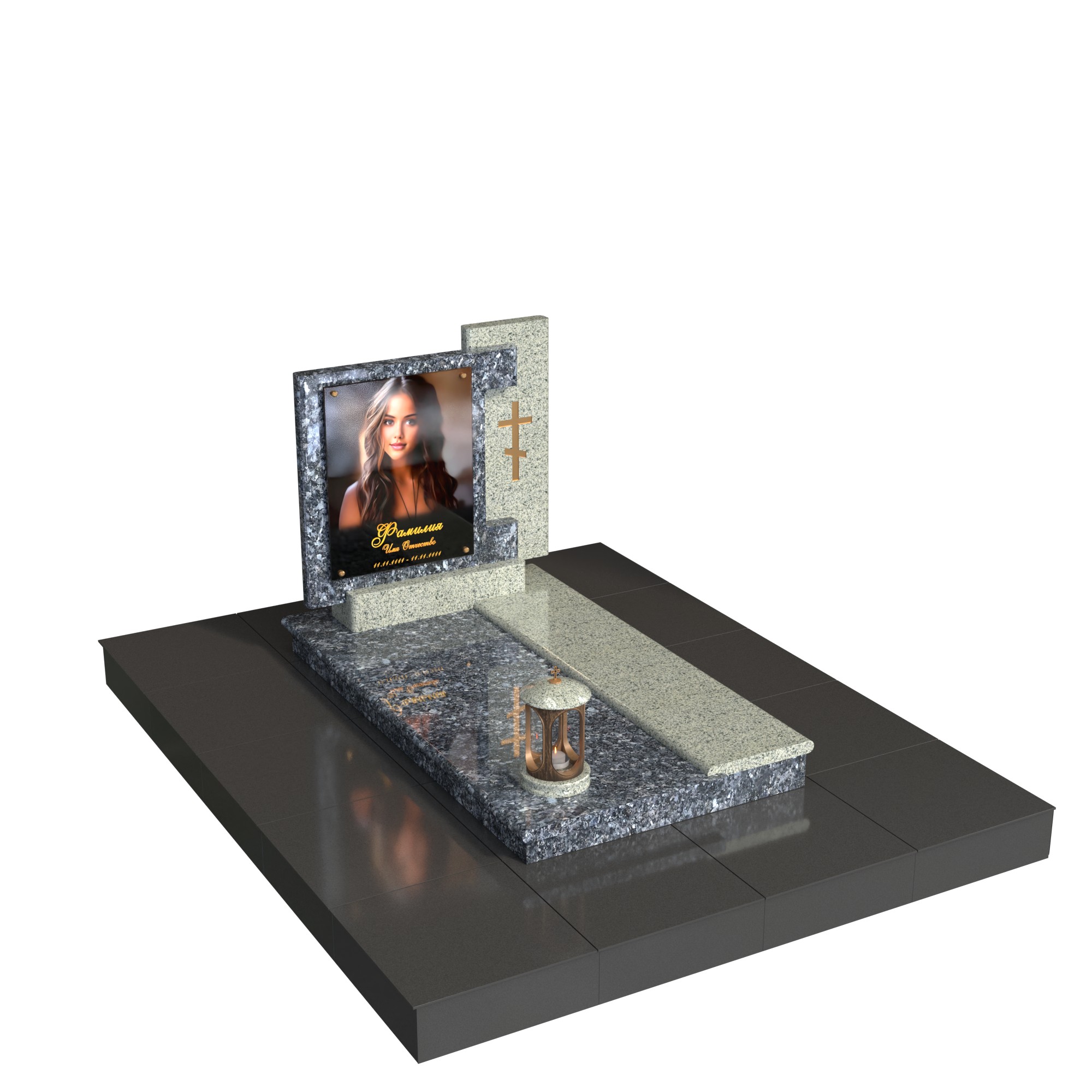 Памятник «Отражённый свет» — современный мемориал из натурального камня с выразительным контрастом фактур. Низкая горизонтальная композиция дополнена лаконичной вертикальной стелой: в центре — фотопортрет на стекле (крепление на метизах), справа — строгая каменная плоскость с аккуратным крестом. Двухуровневая плита, продуманная геометрия кромок и лампада на подиуме создают цельный, ухоженный вид участка.