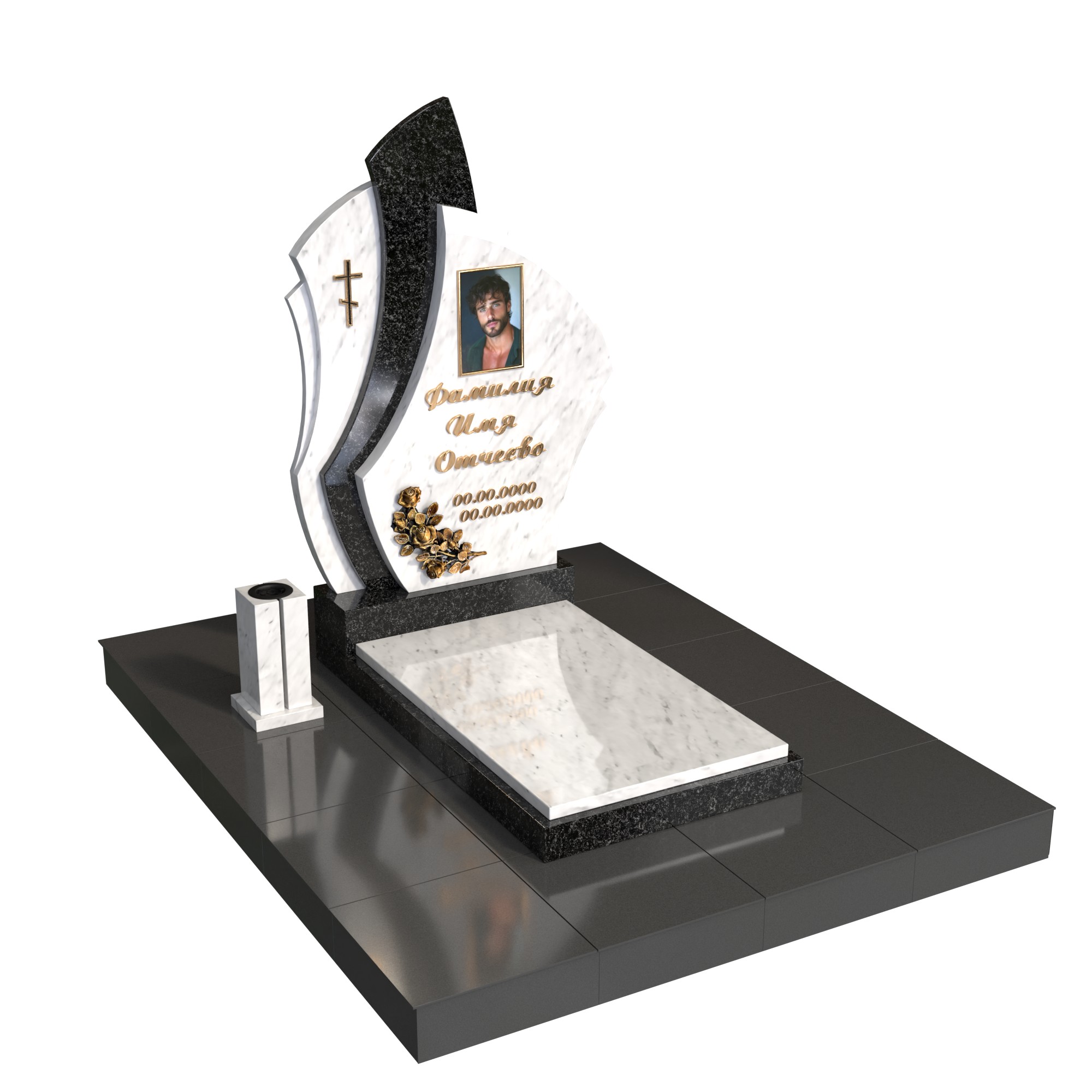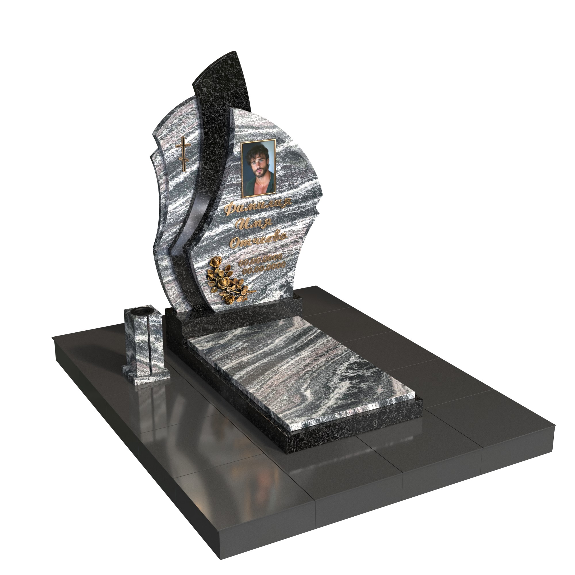 «Парус воспоминаний» — современный одиночный гранитный памятник с динамичной фигурной стелой из двух контрастных плит. Волнообразный силуэт напоминает парус, символ движения души и светлой памяти. Комплекс включает полированную надгробную плиту на двух уровнях, место под портрет (фото на стекле/фотокерамика), элегантный крест и декоративную розетку.