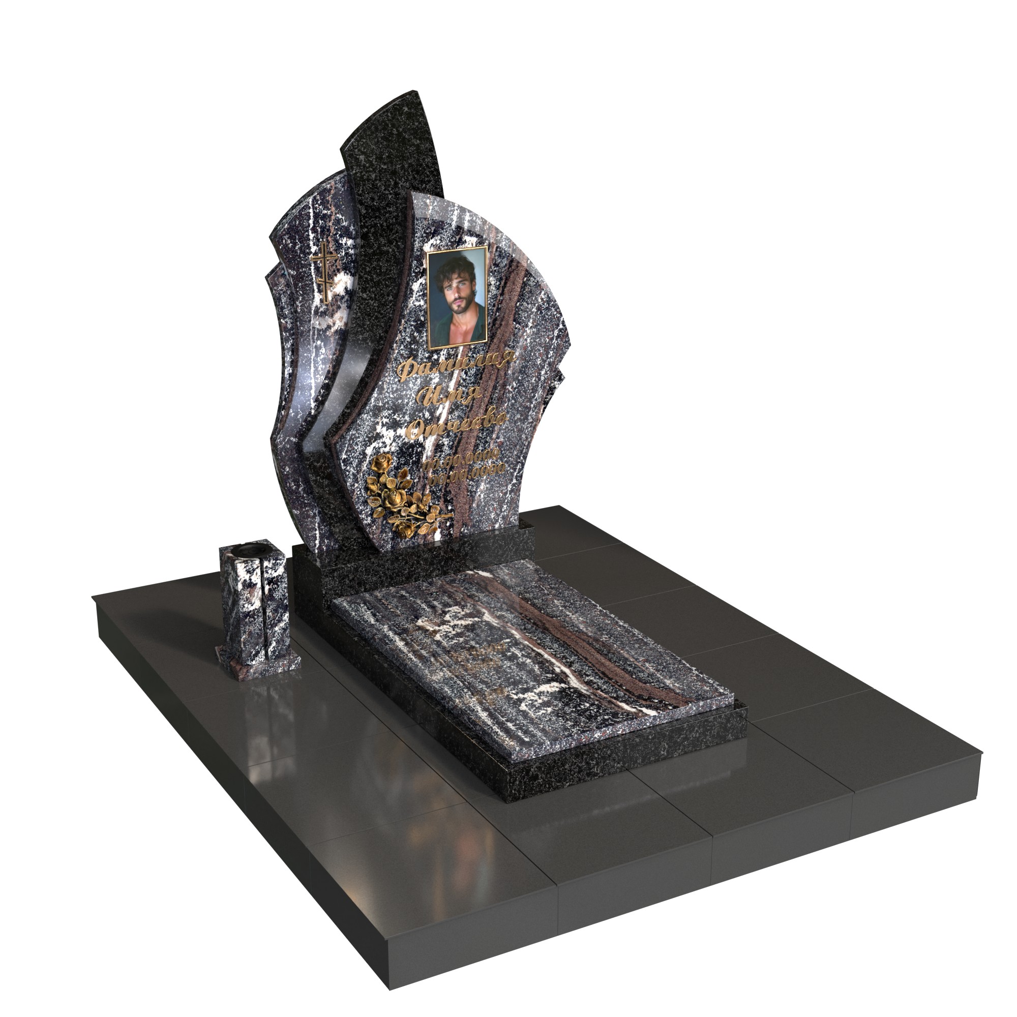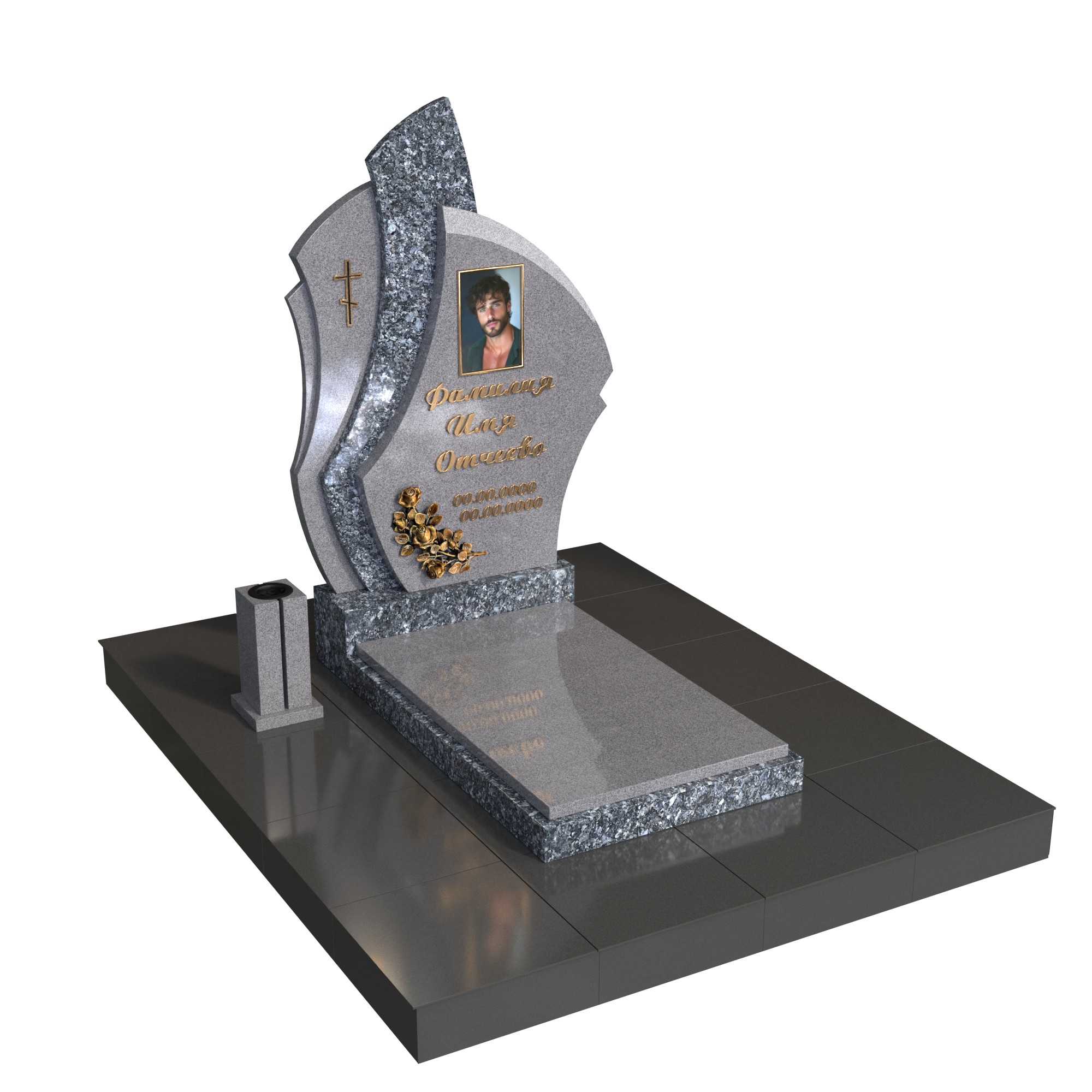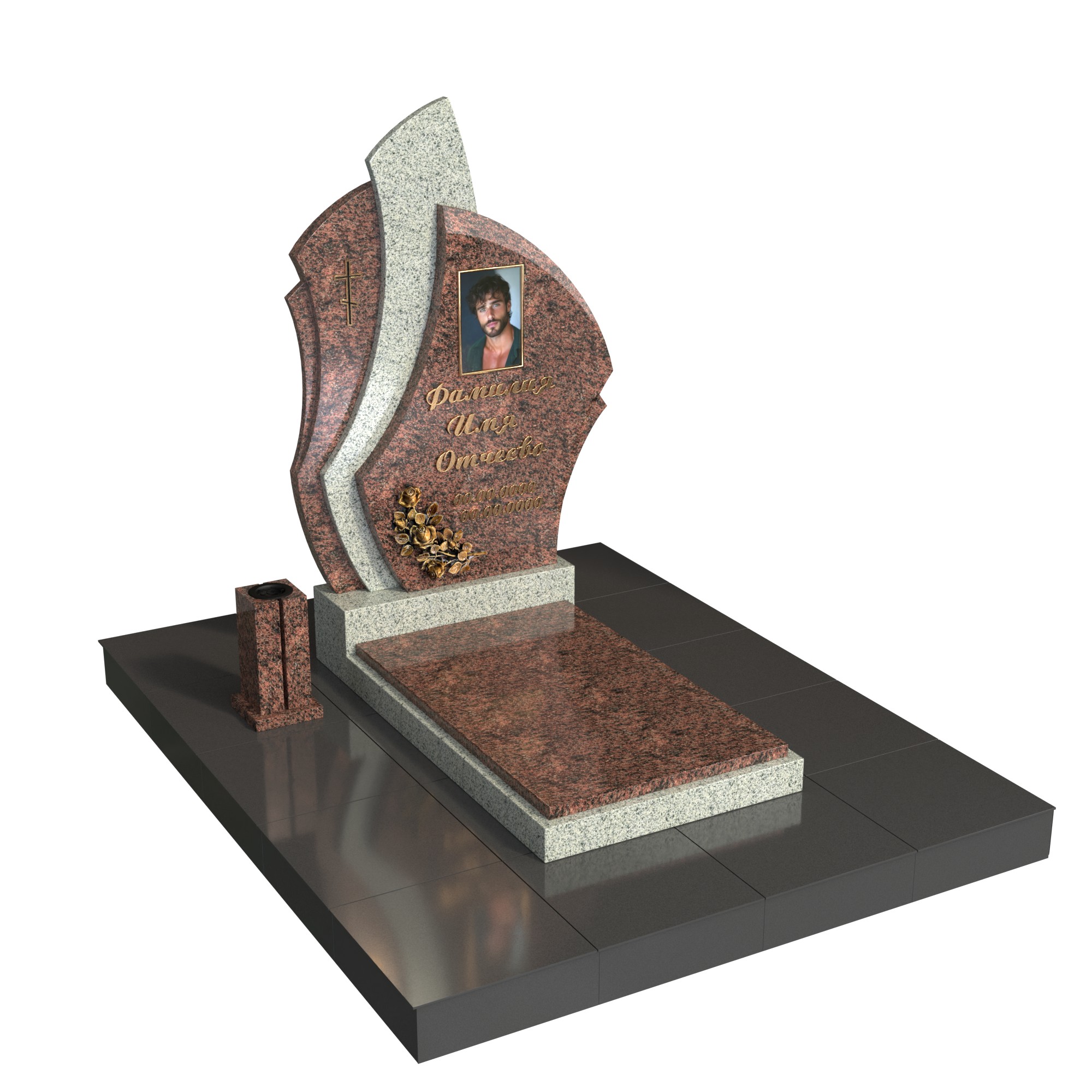 Памятник из натурального гранита устойчив к морозам, влаге и выцветанию, не требует сложного ухода и десятилетиями сохраняет первоначальный вид. Изготавливаем по индивидуальным размерам и макету: подберём шрифт, расположение надписей, тип портрета, бронзовый декор, лампаду и вазон. Возможны варианты фактур (полировка/термо), золотение или окраска букв.