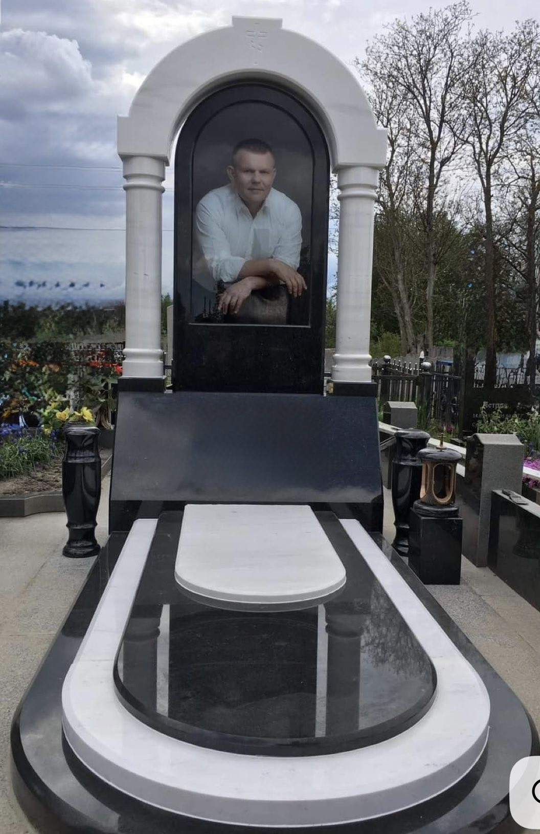Элитный памятник, выполненный в классическом архитектурном стиле, объединяет торжественность и современное исполнение. В композиции гармонично сочетаются два природных камня — белоснежный мрамор и чёрный полированный гранит. Центральным элементом является арочная фотостела с портретом на стекле, обрамлённая мраморными колоннами, что создаёт эффект монументальности и защищённости.