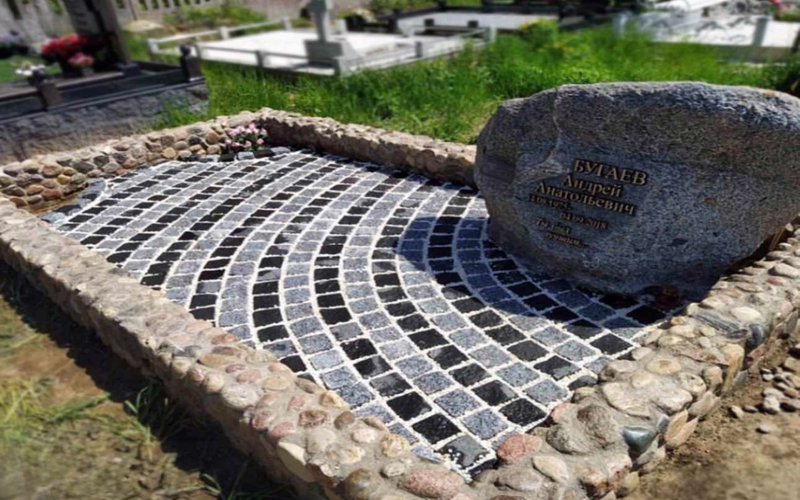 На фото представлена работа по художественной укладке гранитной брусчатки на мемориальном участке. Изогнутая радиальная схема мощения придаёт пространству выразительность и визуальную глубину, подчёркивая форму и индивидуальность памятника.