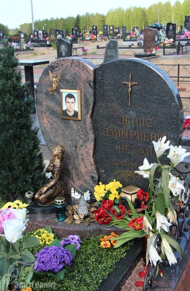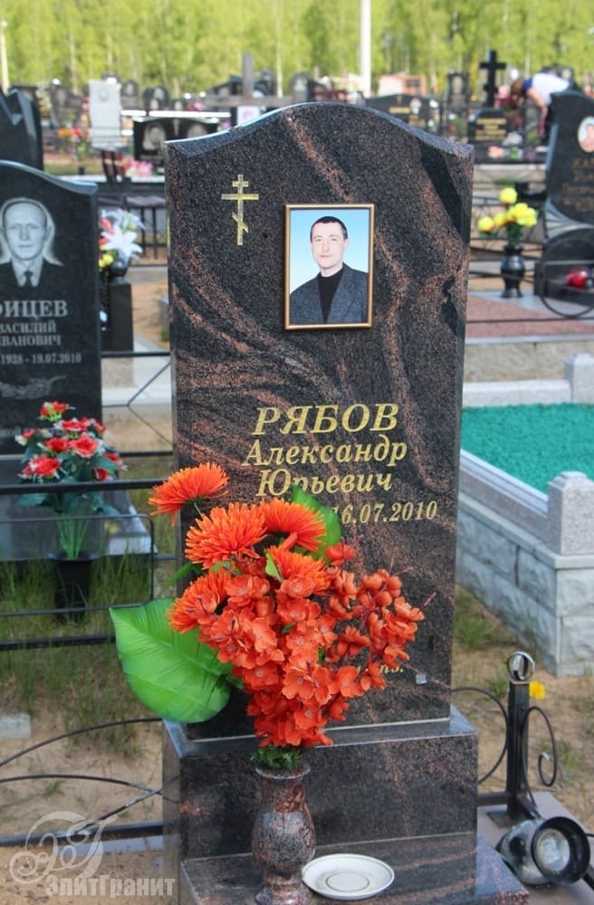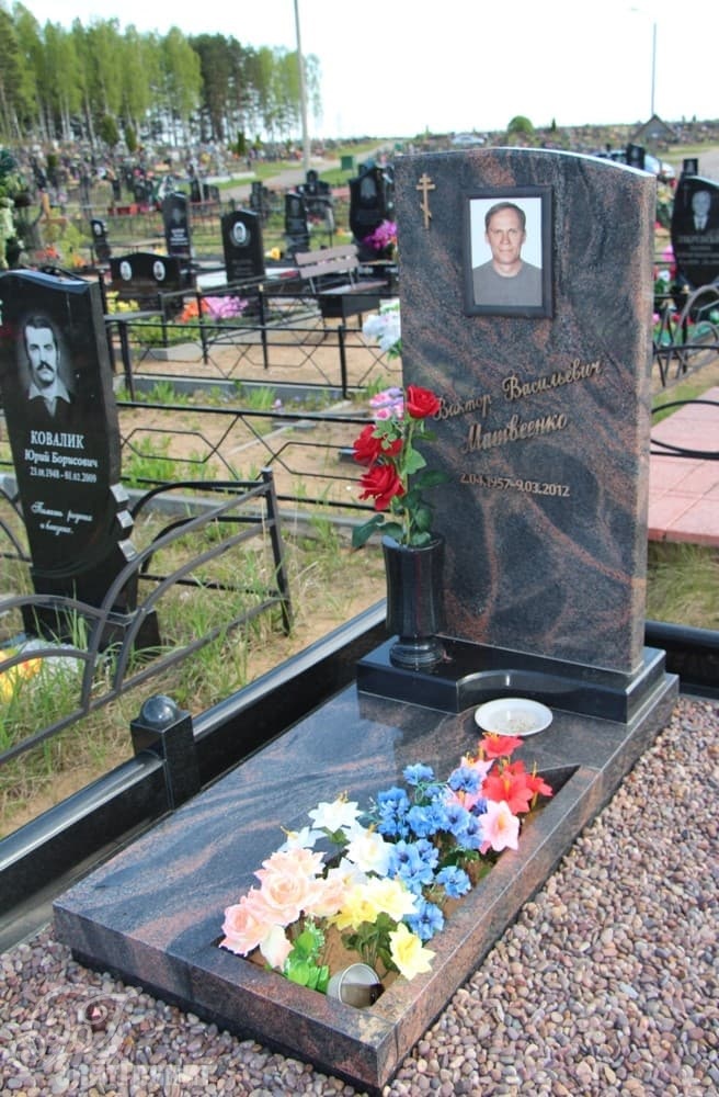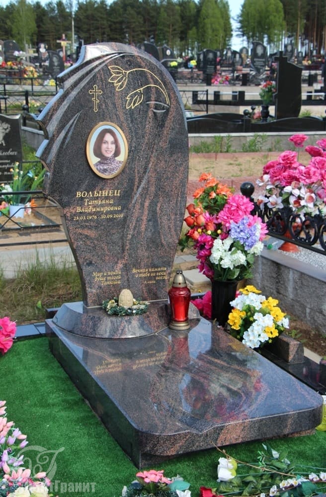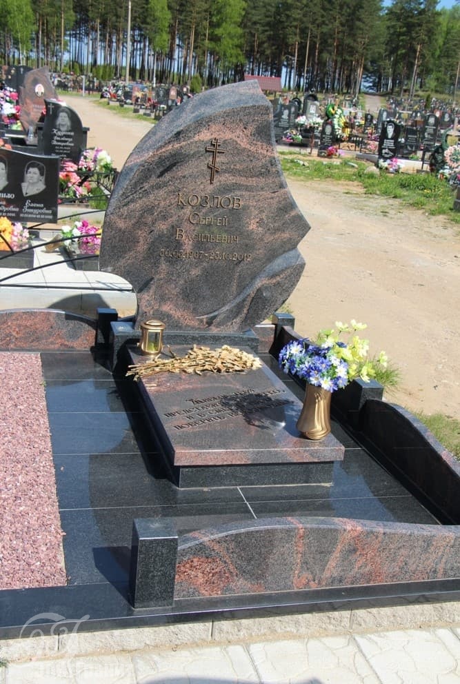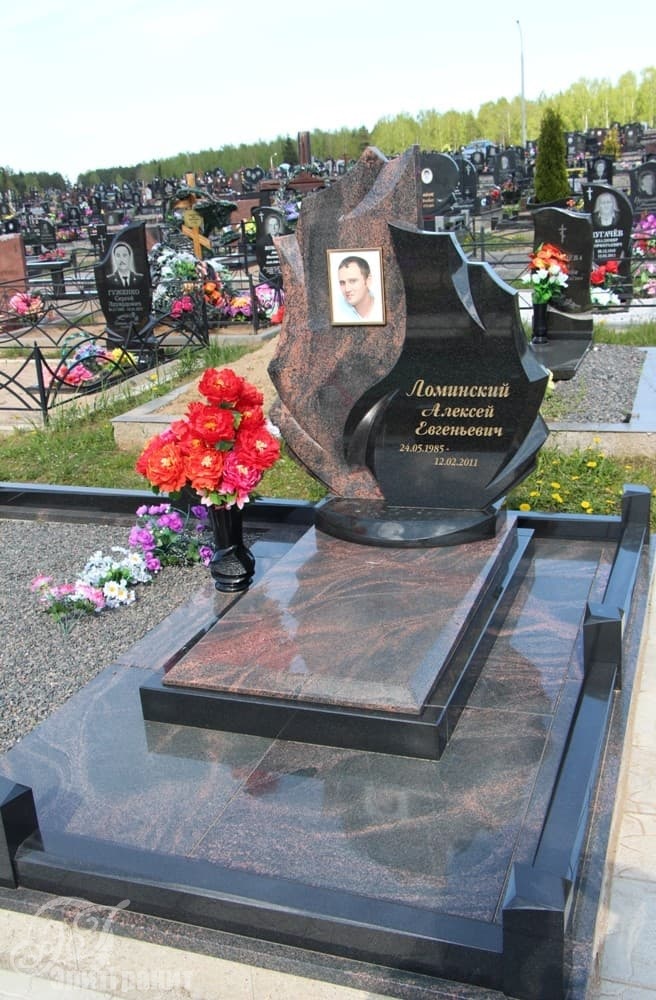 Однако и более плавные и предсказуемые линии мемориальной стелы не подавляют текстуру гранита Aurora: красно-черные переливы создают особую торжественность памятника, подчеркивают монументальную сдержанность.