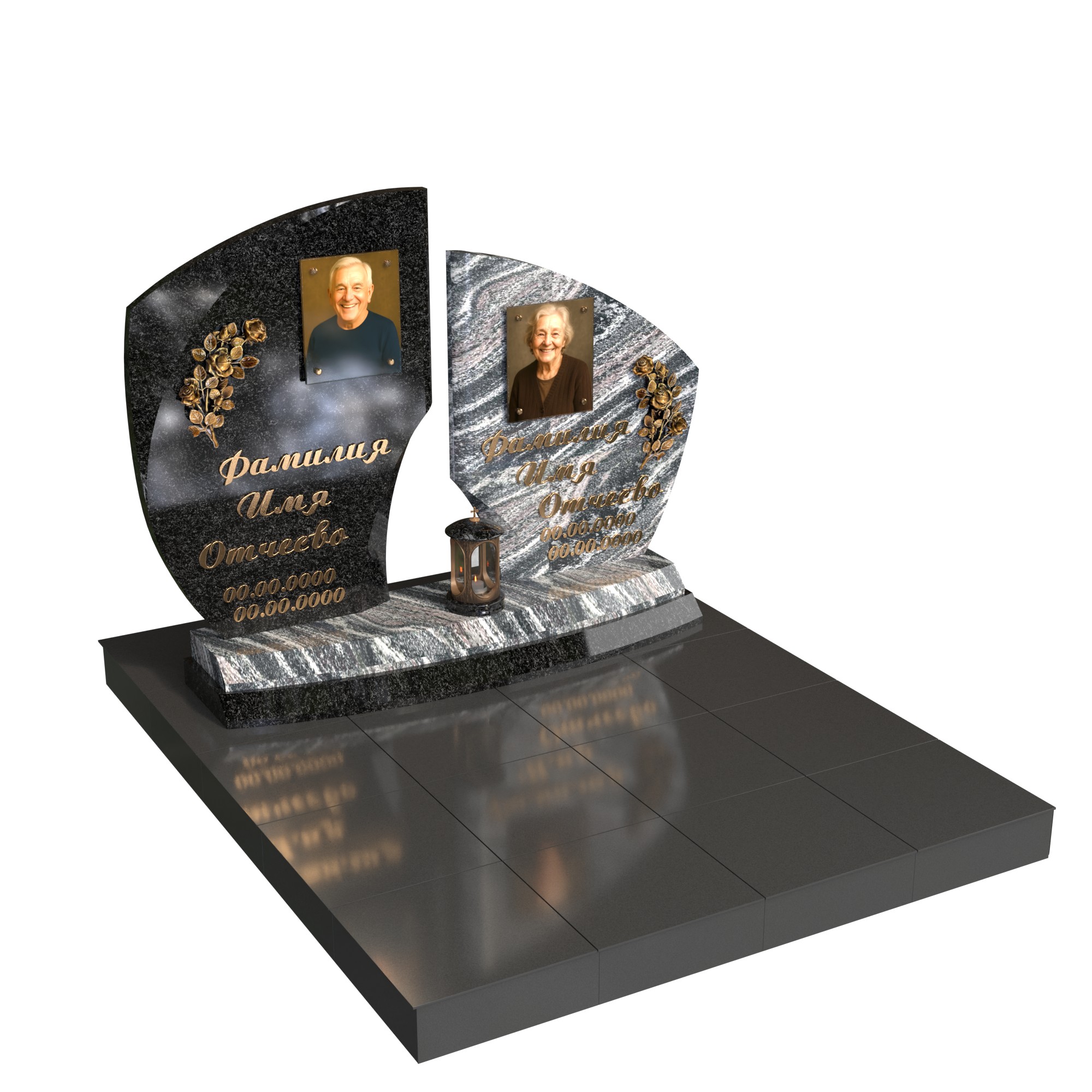 Парный памятник «Два крыла» — элегантный семейный комплекс для двух захоронений. Две асимметричные стелы с мягко изогнутым контуром символизируют два сердца, связанные одной судьбой. В каждой стеле — фотопортрет на стекле (крепление на метизах). Центральная лампада и изящный бронзовый декор подчёркивают торжественность и единство композиции. Основание с плавной линией постамента формирует аккуратный, ухоженный вид участка.