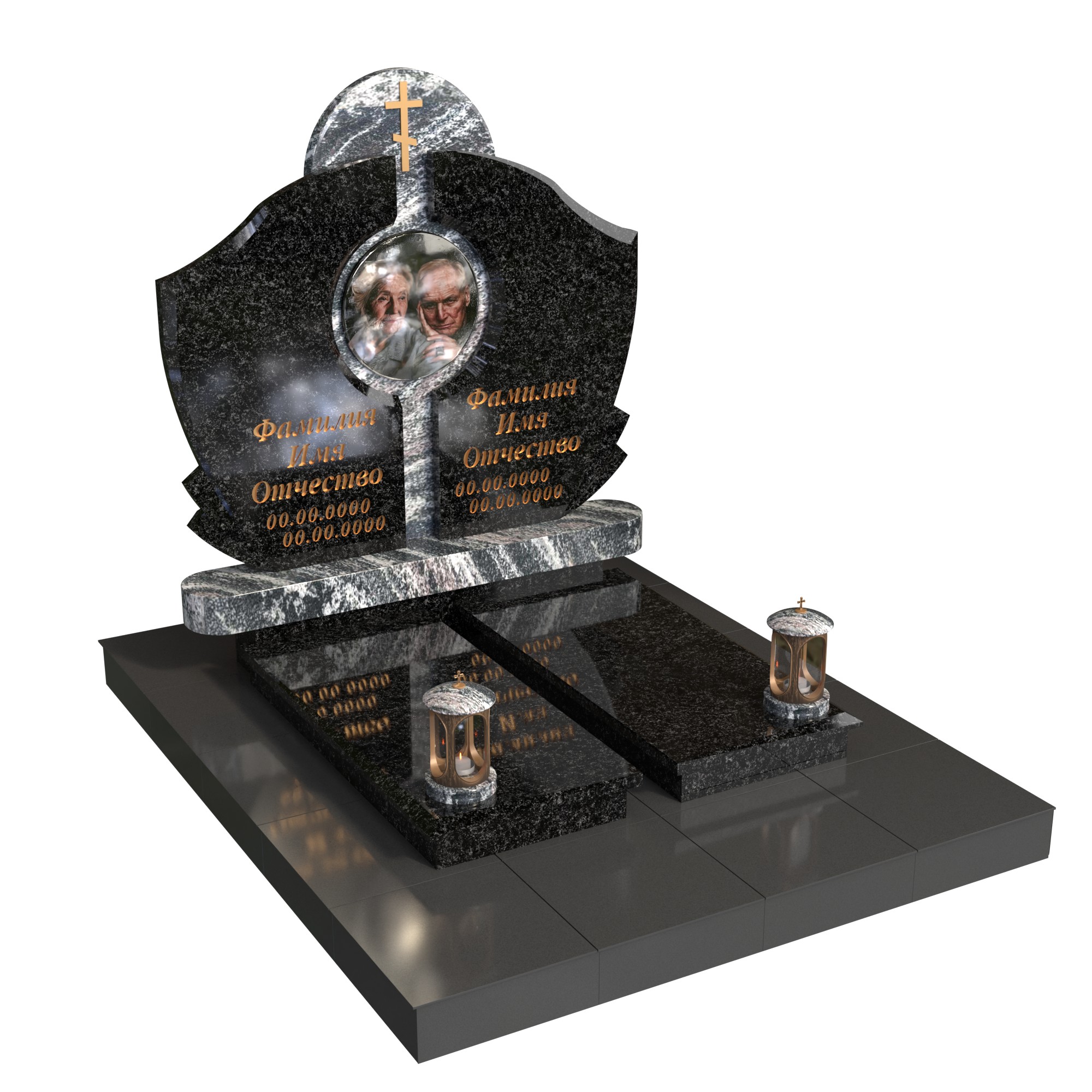 Парный памятник «Семейный оберег» — элегантный семейный мемориальный комплекс для двух захоронений. Объединённая стела в форме щита с круглым фотопортретом на стекле в центре и аккуратным крестом символизирует защиту, единство и духовную связь. Две отдельные надгробные плиты, по одной для каждого, позволяют разместить персональные надписи и эпитафии. Композицию дополняют две лампады, подчёркивая торжественность и цельность ансамбля.