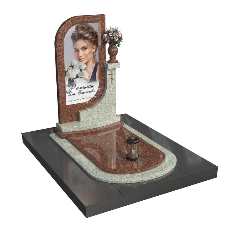 Арочная форма стелы с фотопортретом на стекле символизирует вечную любовь и духовную связь с ушедшим. Плавные линии и контрастные оттенки создают ощущение покоя и завершённости. Дополнительное оформление — бронзовый крест, лампада и изящная ваза — подчёркивают индивидуальность памятника и придают композиции выразительность.